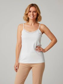 Under V-neck knits or blouses, a refined singlet base layer works beautifully. The TBL Cotton Singlet Top with Guipure Lace offers lightweight warmth while remaining discreet under clothing, making it ideal as a base garment beneath workwear.