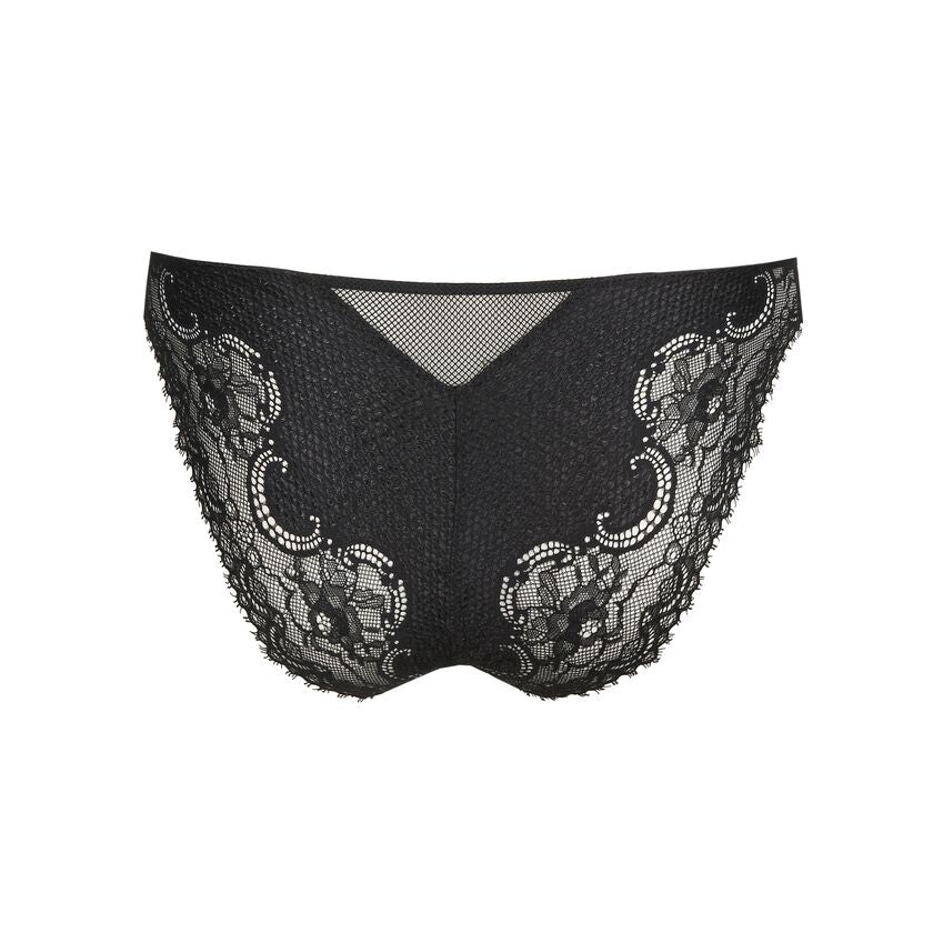 Junoo Rio Brief Black from The Foundation displayed flat, showcasing the intricate lace, mesh detailing and contemporary style