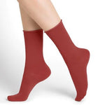 Warm, wool mid-length socks for women from Bleuforêt are French-made luxury for your feet in beautiful Marsala red colour. These ladies woolen socks are cotton-lined so that the 100% merino wool does not come in contact with the skin to reduce any itch or irritation on the skin. These women's socks have roll tops so they don't dig into your legs and they are fine and soft enough to wear with shoes or boots for winter.