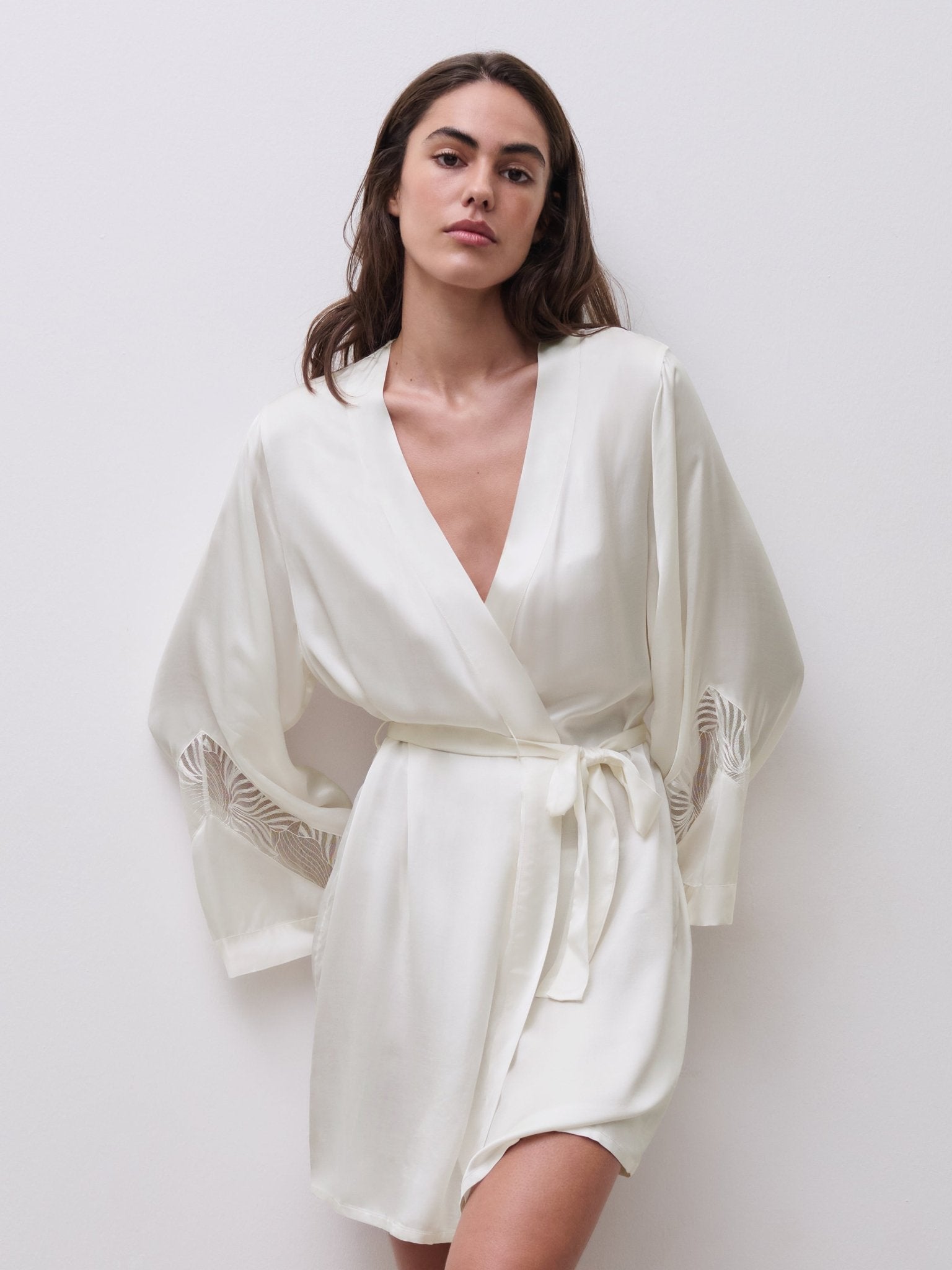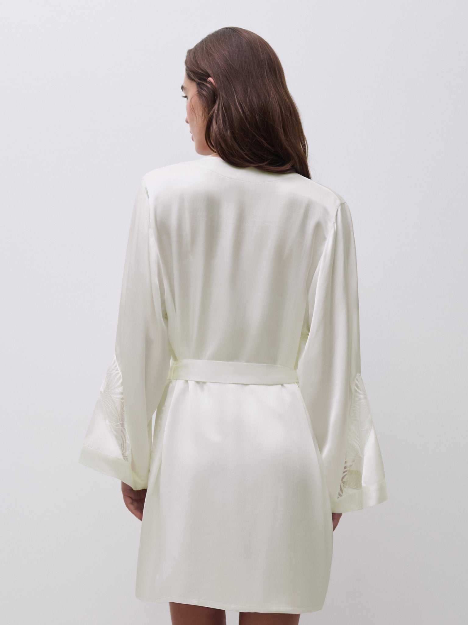 Chantelle Legend Satin and Modal Kimono Robe in milk / white is a stunning fusion of floral embroidery and sensual sheerness. With a tie waist and beautiful lace inset at the sleeves this is a beautiful robe for bridal celebrations or every day elegance. Matching nightdress sold separately and also available in black. Designed in France.