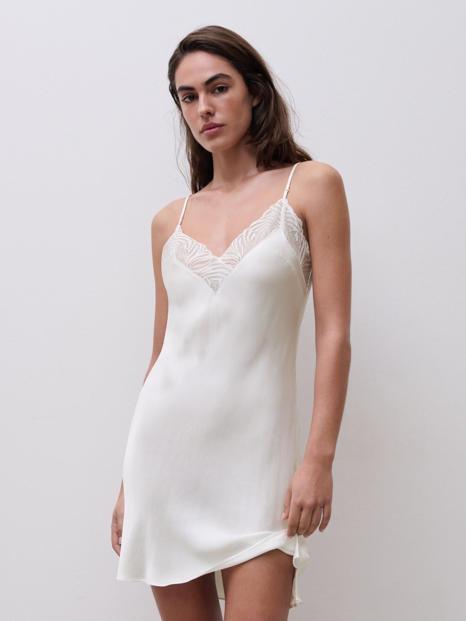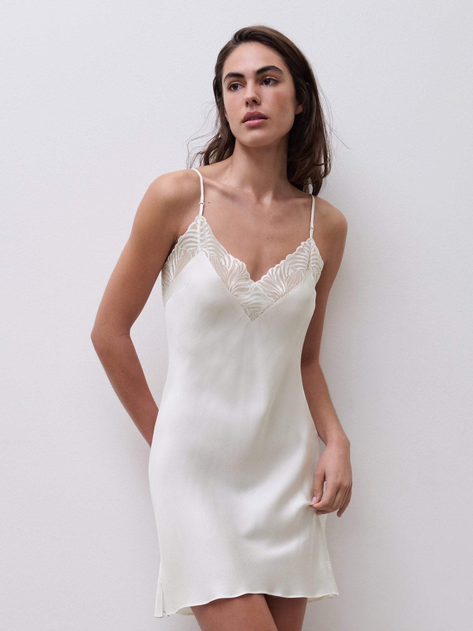 Chantelle Legend Satin and Modal nightdress in milk / white is a stunning fusion of floral embroidery and sensual sheerness. It has adjustable spaghetti straps and plunging neckline with a low back for a sensual look. Sheer lace panel frames the neckline. Matching robe available and also comes in black. Designed in France.