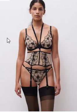 The stunning graphic floral lace in the new Chantelle Pulp Lush collection makes this Wirefree Triangle Bra an attention-getting addition to your lingerie wardrobe. The bold lace is certainly used to full effect in this beautiful wirefree bra - with the pale blush lining really making the floral lace detail pop. The delicate black velvet ribbon that trims the tulle on the cups is a nice compliment to the soft elasticated under bust band that finishes off this bra. Make sure to complete the look with the matching brief or thong and add to the wow factor by adding the waist cincher or chemise.