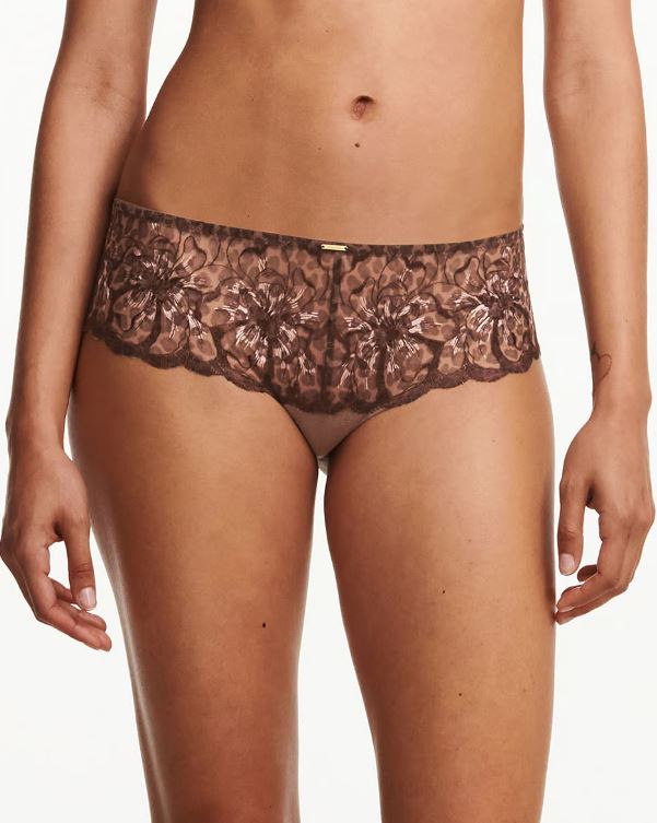 The Foundation’s Chantelle Waltz Shorty Brief in black – mid-rise lace brief with semi-sheer floral design and scalloped trims for feminine flair.