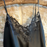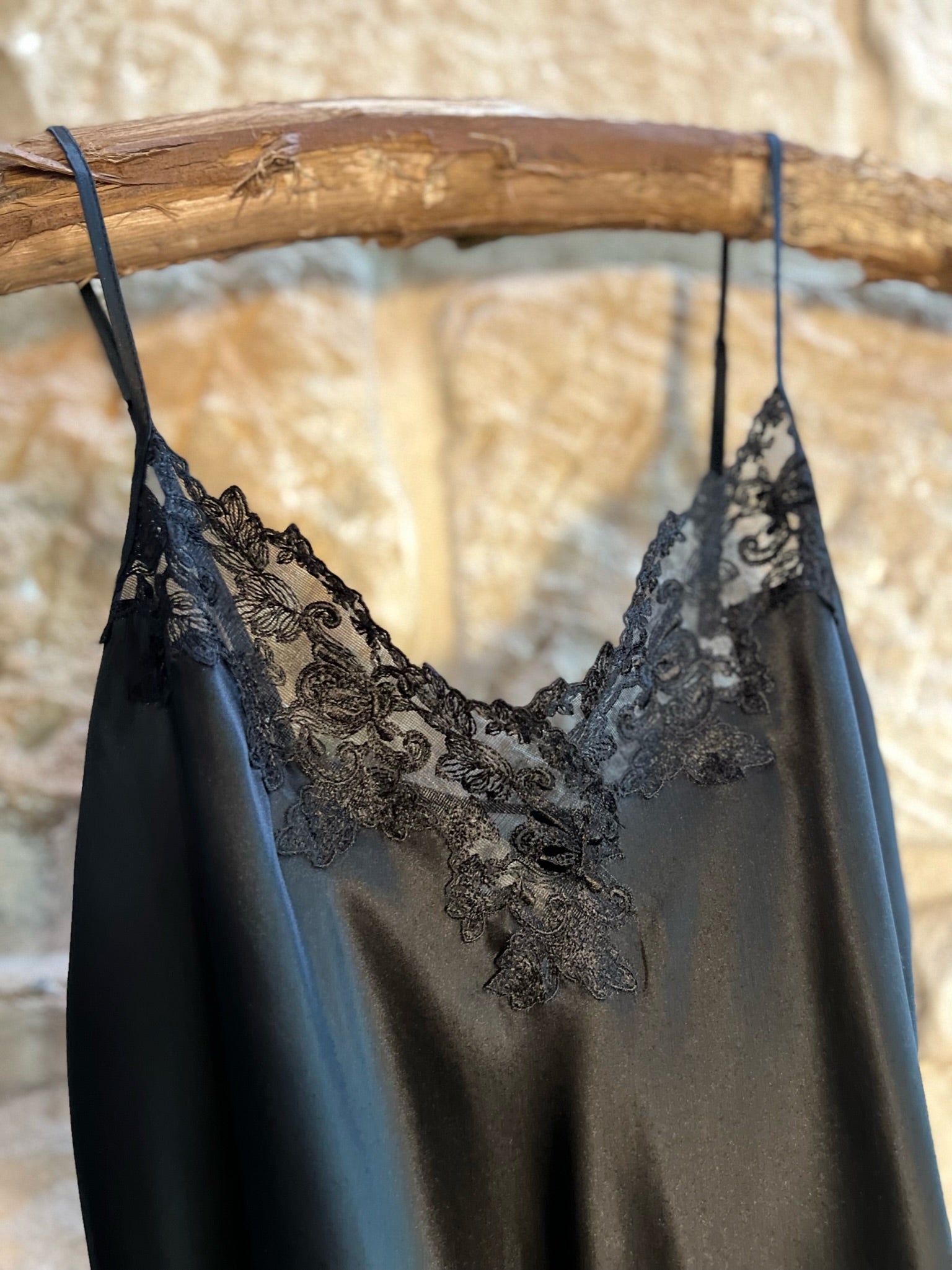 Lotus Kathryn Silk Lace Chemise is a 100% Mulberry Silk Nightie with lace trim details. A sexy silky nightdress for slipping into bed. Made by Lin and Barrett Lingerie and now The Foundation, the classic black colour option has matching lace trim.