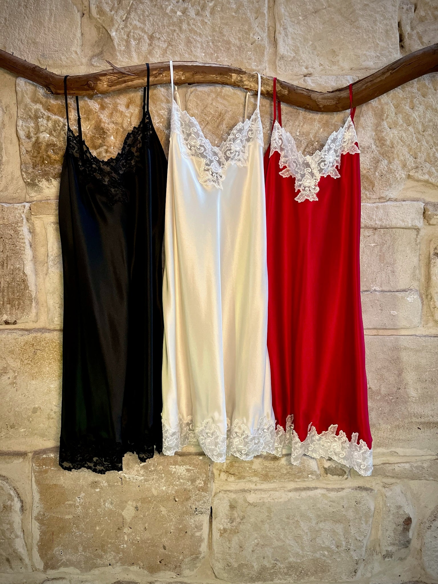 The Kathryn Silk Chemise with lace trim is cut on the bias for a flattering drape and falls to mid thigh length.
