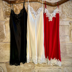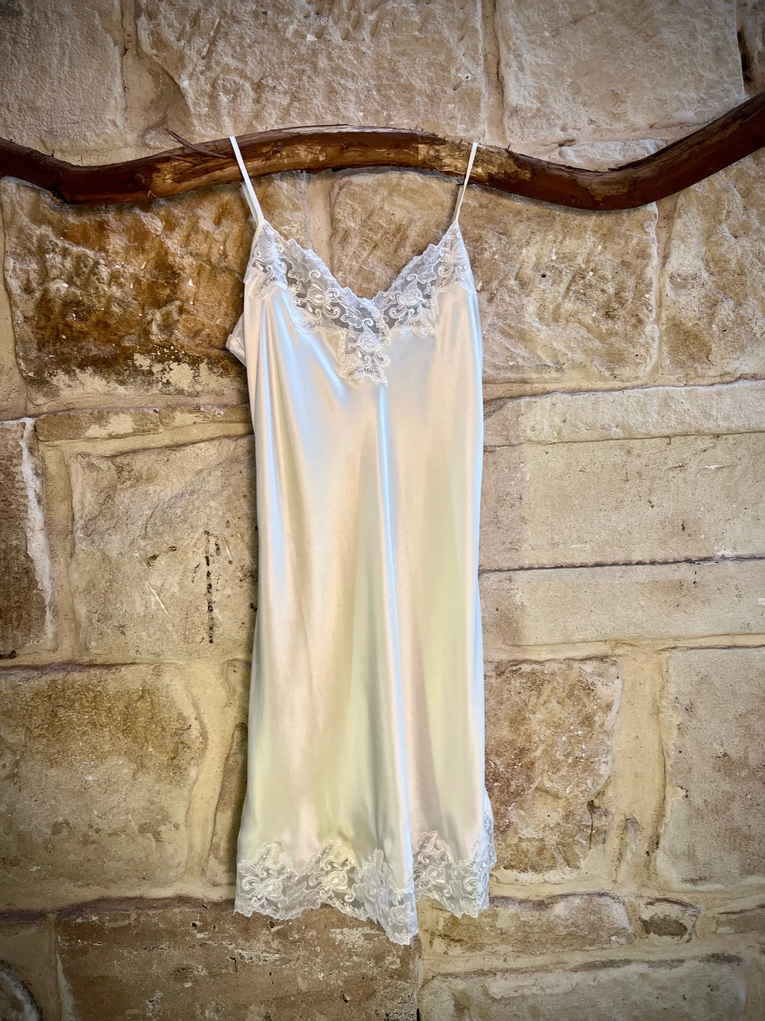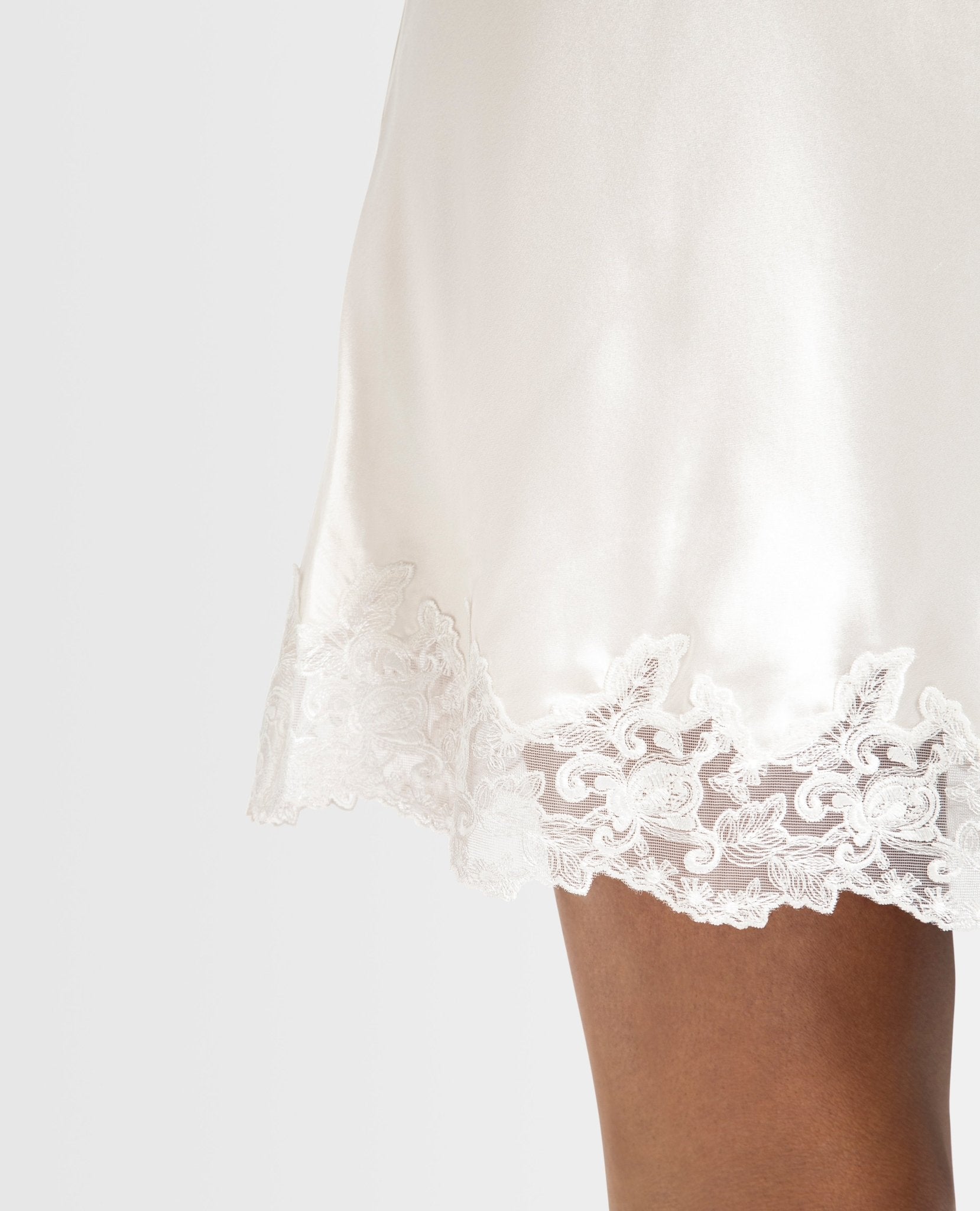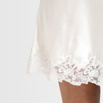 The Kathryn Silk Chemise with lace trim is cut on the bias for a flattering drape and falls to mid thigh length.