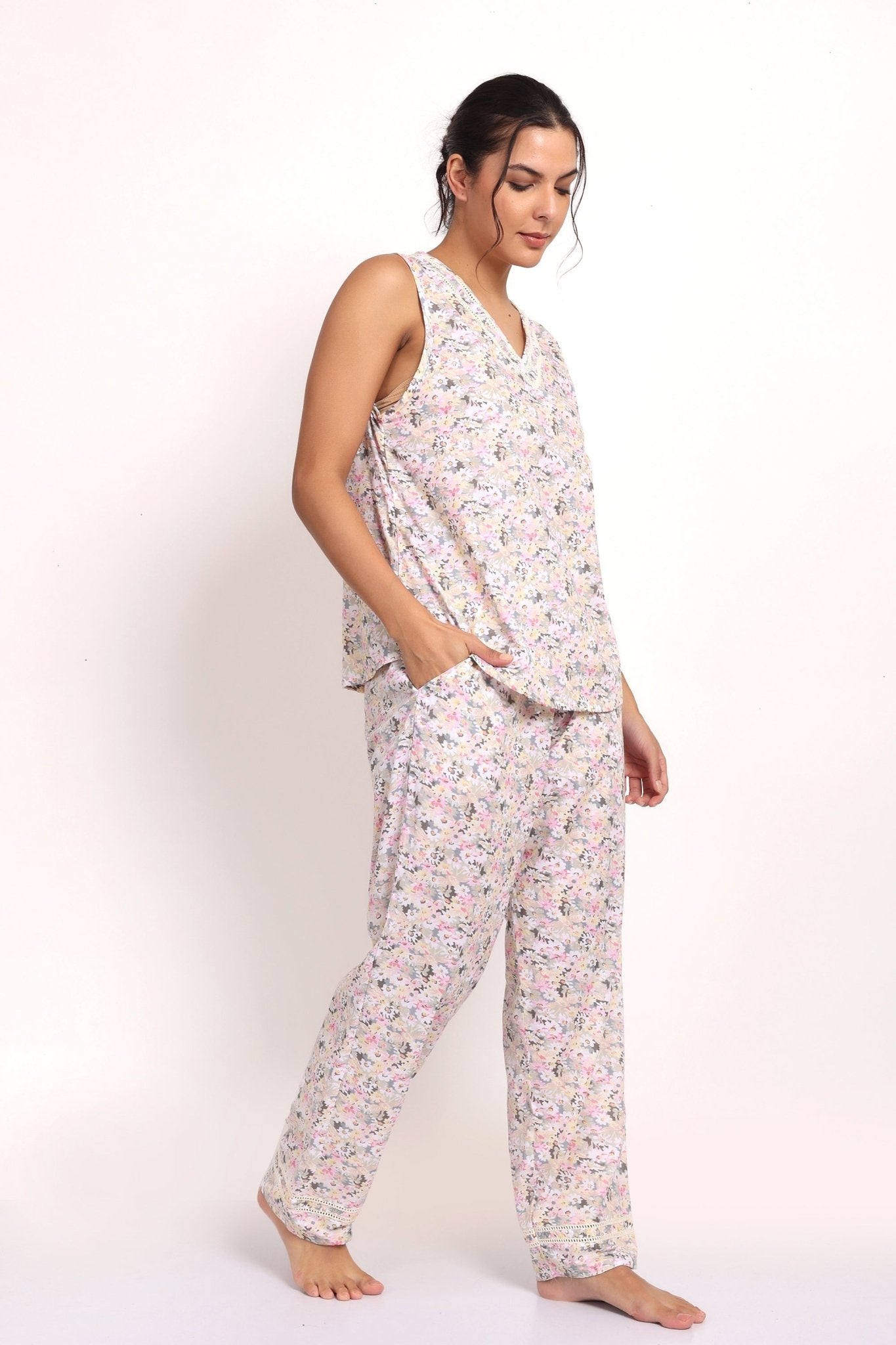 Side profile of model in relaxed-fit Gatsby floral PJ set showing breezy sleeveless top.