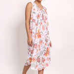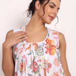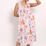 Model wearing sleeveless coral print nightie with gathered neckline and relaxed fit.