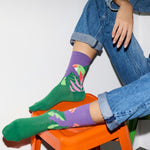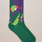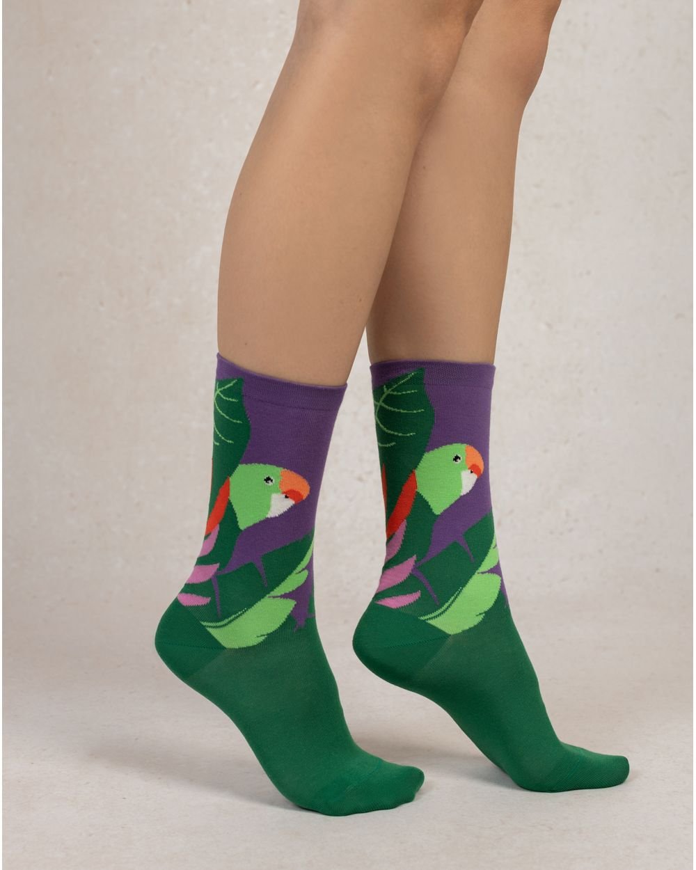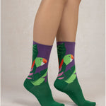 Cotton women's socks by Bleuforet, in fun prints are a great gift for the women who has everything. These ladies cotton socks are 18 gauge and feature a parakeet bird print on the side. Vibrant purple and green with a bird and leaf print. Beautifully made in quality cotton, fun patterned novelty socks like these make great presents. Bird lovers will love these ladies cotton, mid-length socks. One size (36-40 EU) fits most.