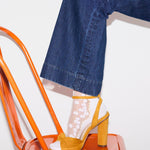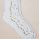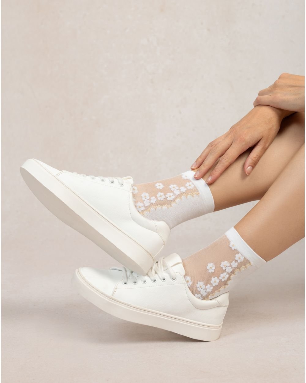 Bleuforet's Short Sheer flower socks are transparent on the top of the foot and sewn with shimmering threads and a scattering of little white flowers with gold centres. Cotton soles with soft ribbing, flat toe seams and reinforced heels and toes, these beautiful women's socks are made in France from quality fibres.