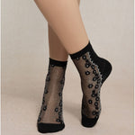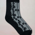 Bleuforet's Short Sheer flower socks are transparent on the top of the foot and sewn with shimmering threads and a scattering of little black flowers with gold centres. Cotton soles with soft ribbing, flat toe seams and reinforced heels and toes, these beautiful women's socks are made in France from quality fibres. Available in white also.