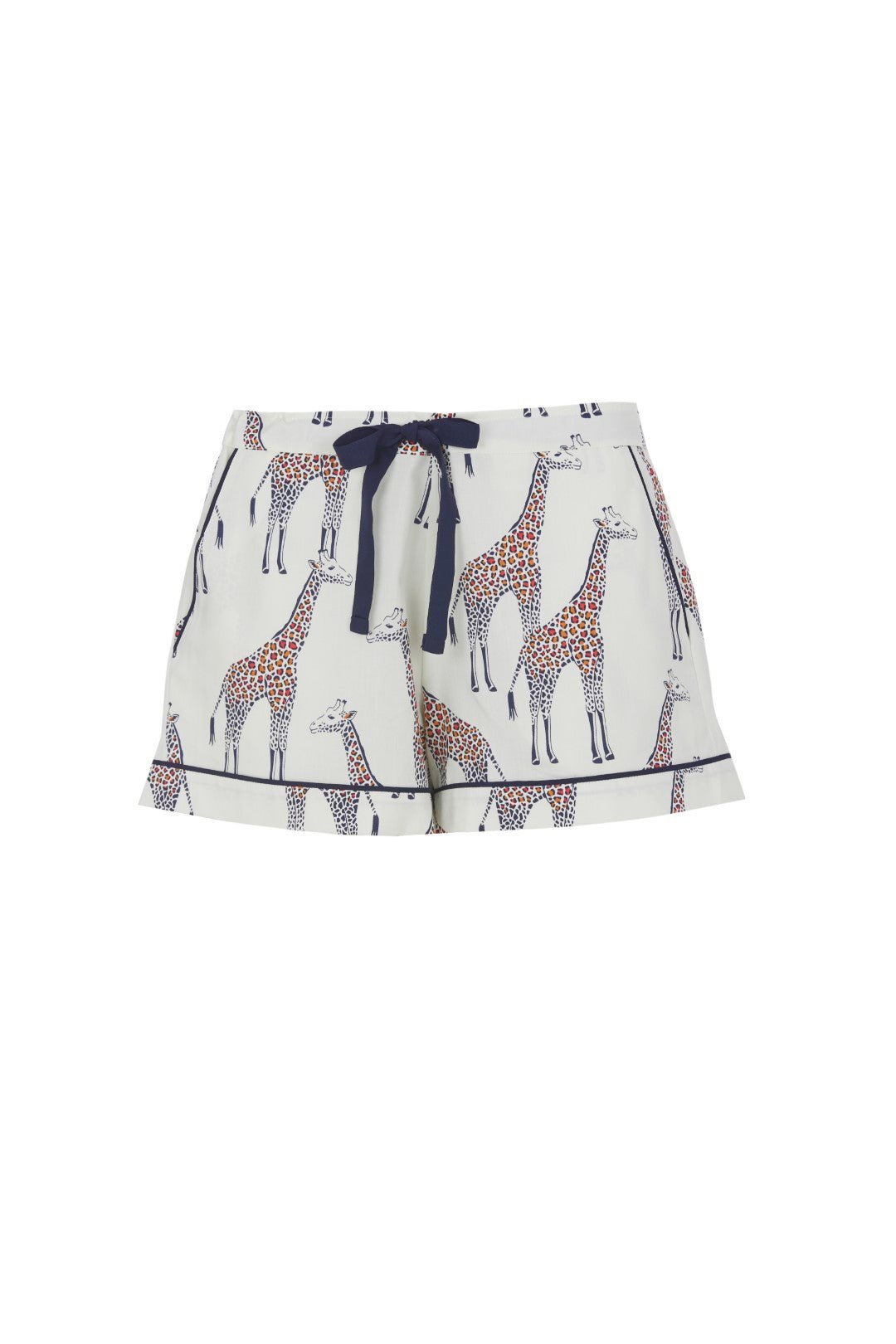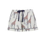 Georgina Shorts: Designed from 60% cotton and 40% modal, the wide-leg shorts feature a whimsical giraffe print, a flat front, elasticated back with drawstring for perfect fit, deep cuffed hems, and side pockets. Finished with navy modal trim for cohesive styling.