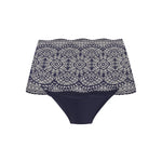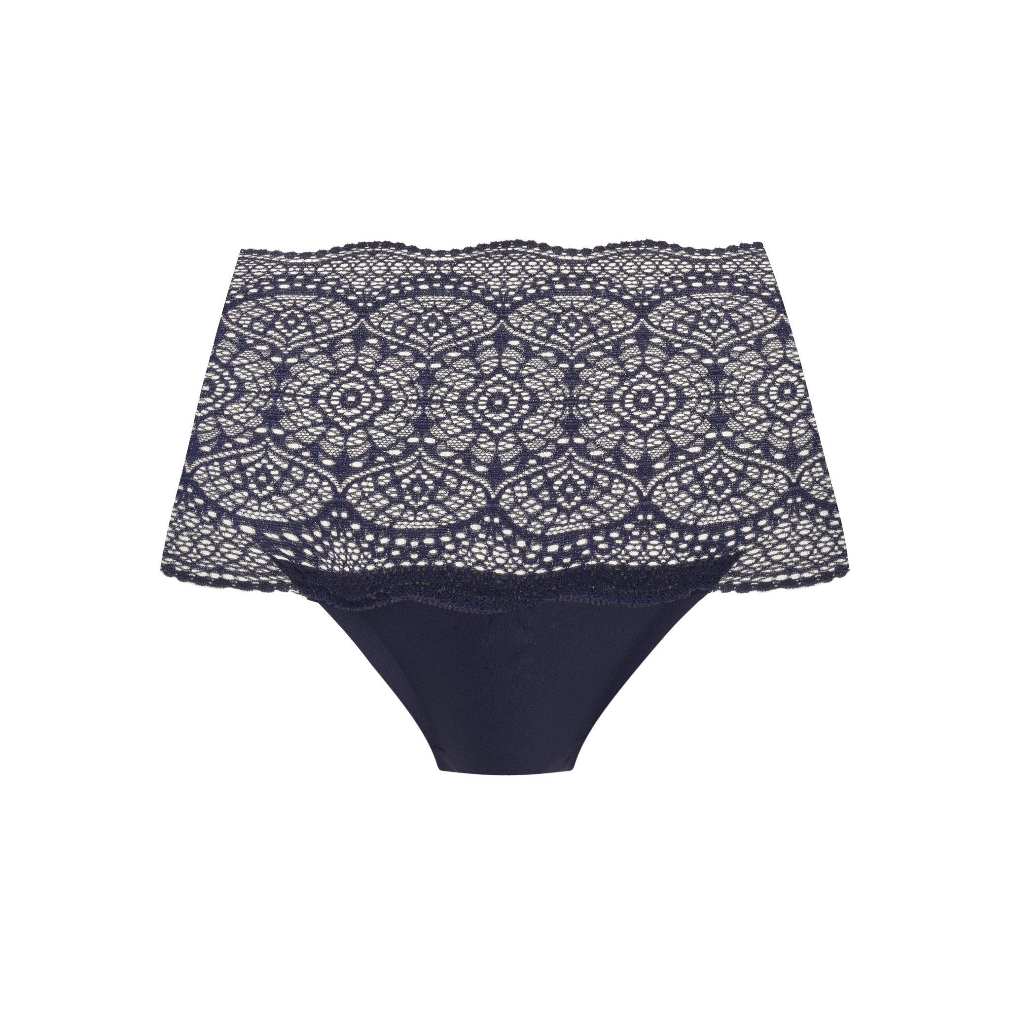 Deep navy full brief in soft stretch lace with a flattering high-waisted shape. Features bonded seams for a smooth silhouette with no visible lines.