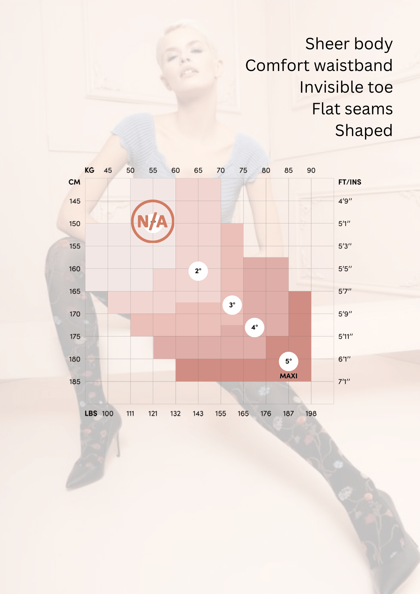 Sheer to waist, with a comfort waistband, invisible toe, flat seams and shaped cotton gusset.  Available also in size Maxi with back panel gusset. Choose from 4 fashion colours.