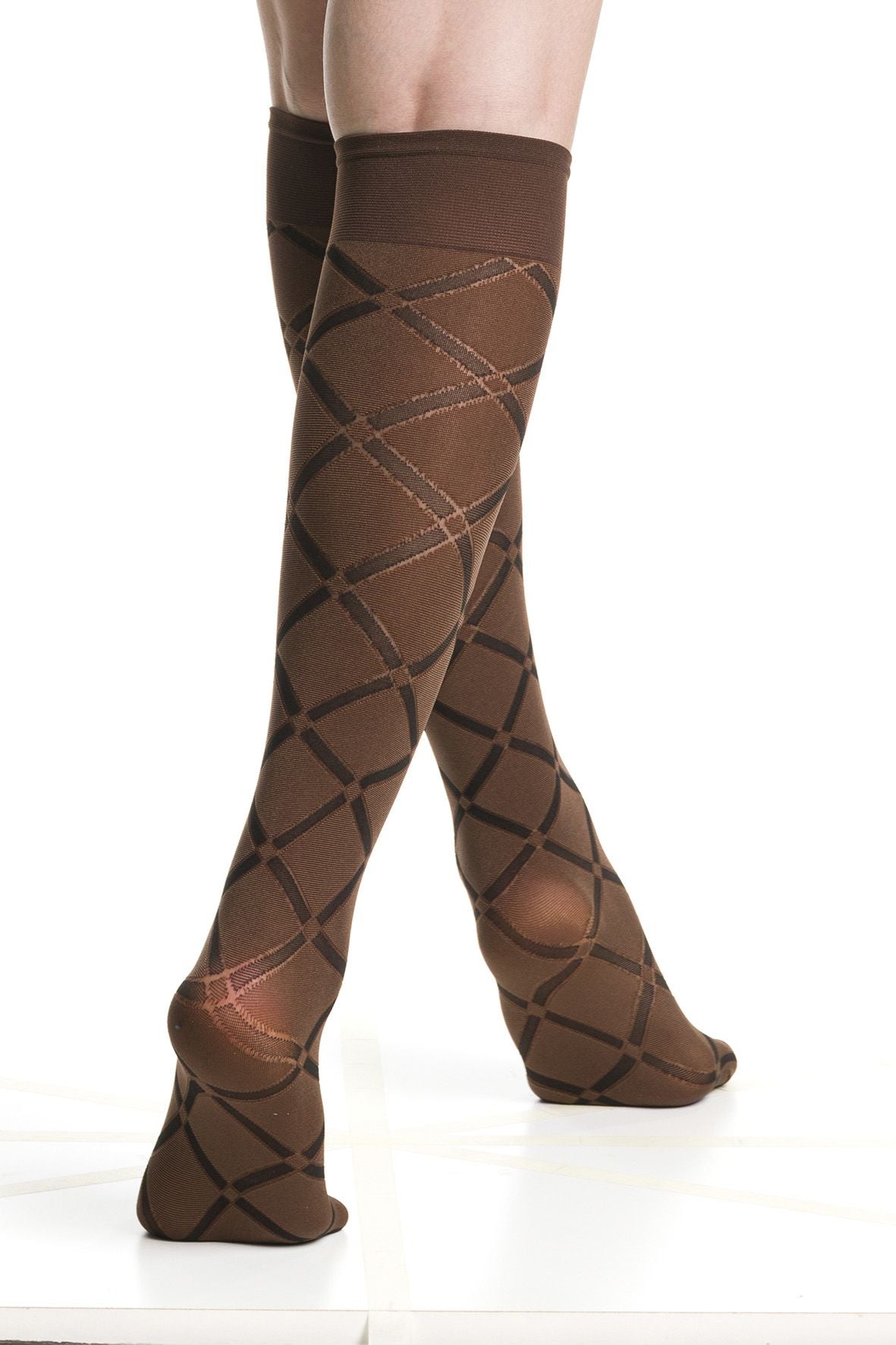Trasparenze Monsoons Opaque Knee High Stockings in 50 denier with a diamond geometric check pattern are great fashion for your feet. Fine Microfibre knee high stocking stocks are great for winter with boots or shoes. Available in two fashion colours, Brown and Green.