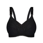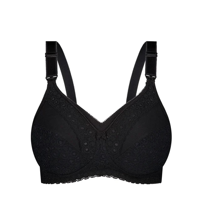 Front view of The Foundation’s Lace Maternity Bra in black, featuring soft cotton-lined cups and wide supportive straps.