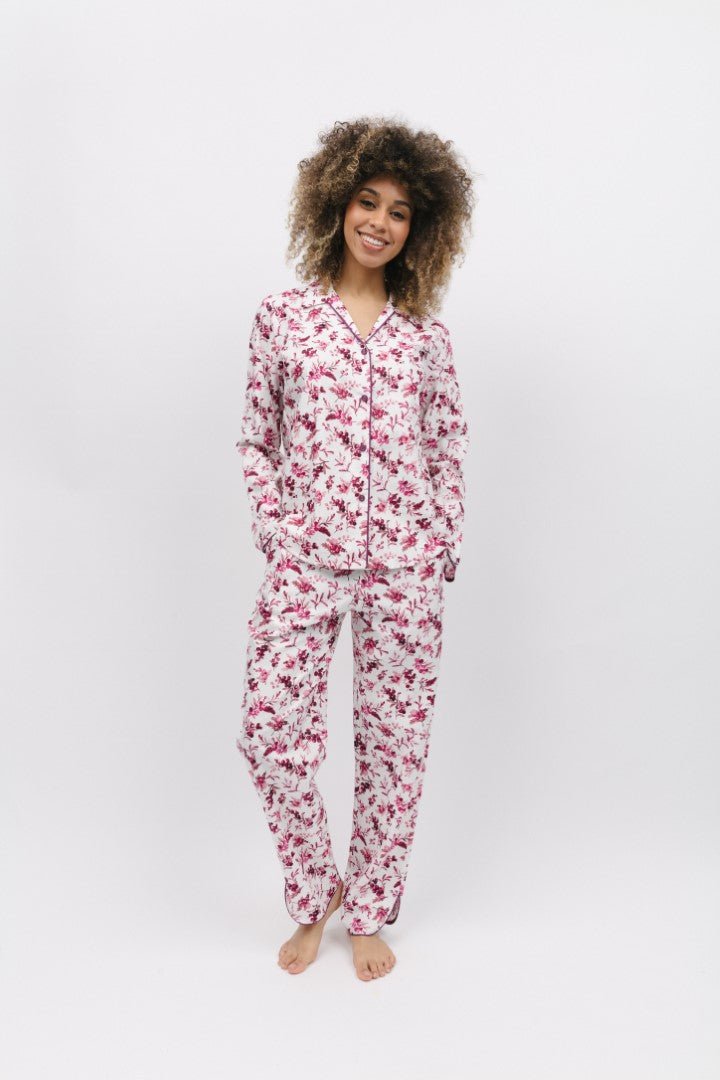 CyberJammies Eve Cream Berry print PJ Set is a classic pyjama made with 60% cotton and 40% modal so you won't overheat in this breathable but cosy PJ set. White base berry print in shades of magenta, pink, burgundy with magenta modal trim. The pants feature an elastic waist at the back and drawstring front with side pockets and the matching top with revere collar modal covered buttons.