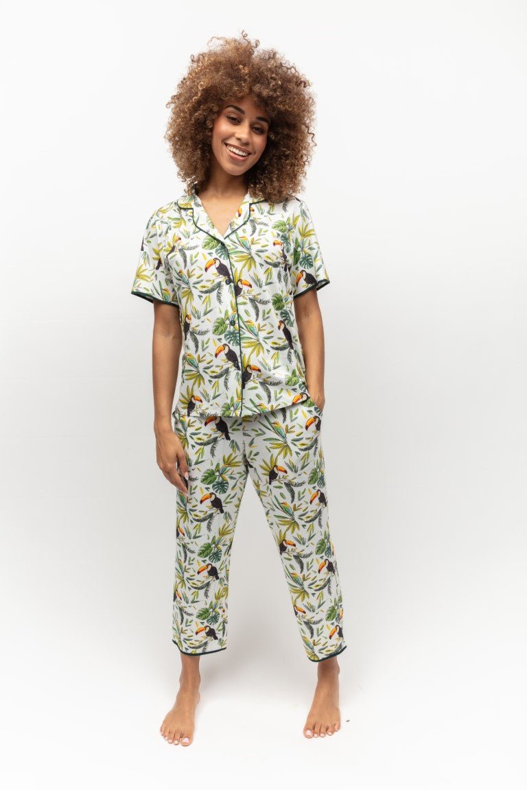 The pyjama top, made from a luxurious blend of 52% cotton, 41% modal, and 7% elastane, is adorned with a vibrant toucan print and finished with dark green modal buttons and trim. The cropped pyjama bottoms echo this elegance, offering both style and comfort for those hot summer nights.