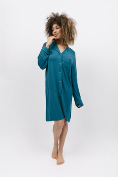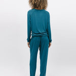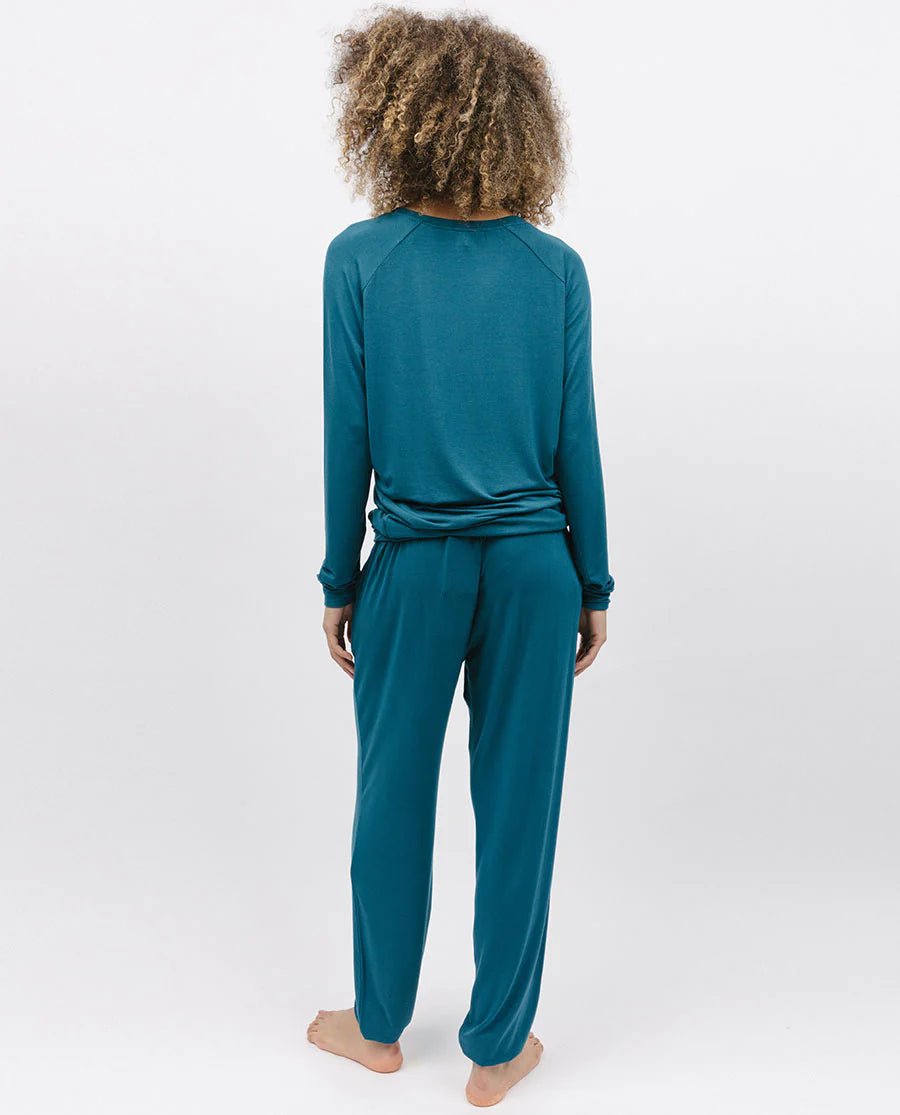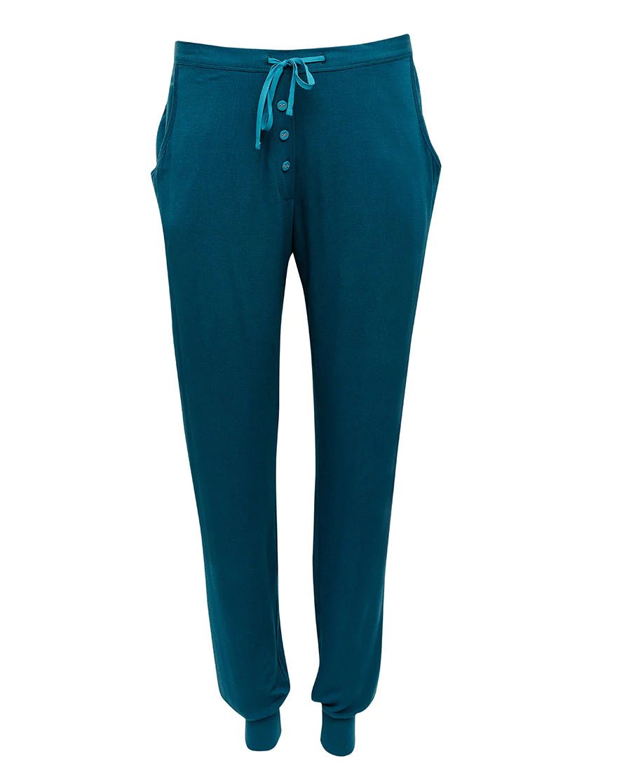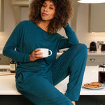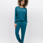 CyberJammies Modal knit sets are super comfortable sleepwear that you will want to wear night and day. Made with 95% modal and 5% elastane with light teal trim and a rich teal blue hue. The long sleeve slouch top is paired with long cuffed pants and feature two side pockets, elasticated waistband at the back and a drawstring at the front to ensure a perfect fit. Decorative buttons at the front for additional detail, you won't feel embarrassed to open the front door wearing these pyjamas from the CyberJammies Carina collection.