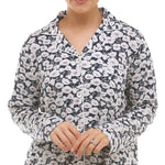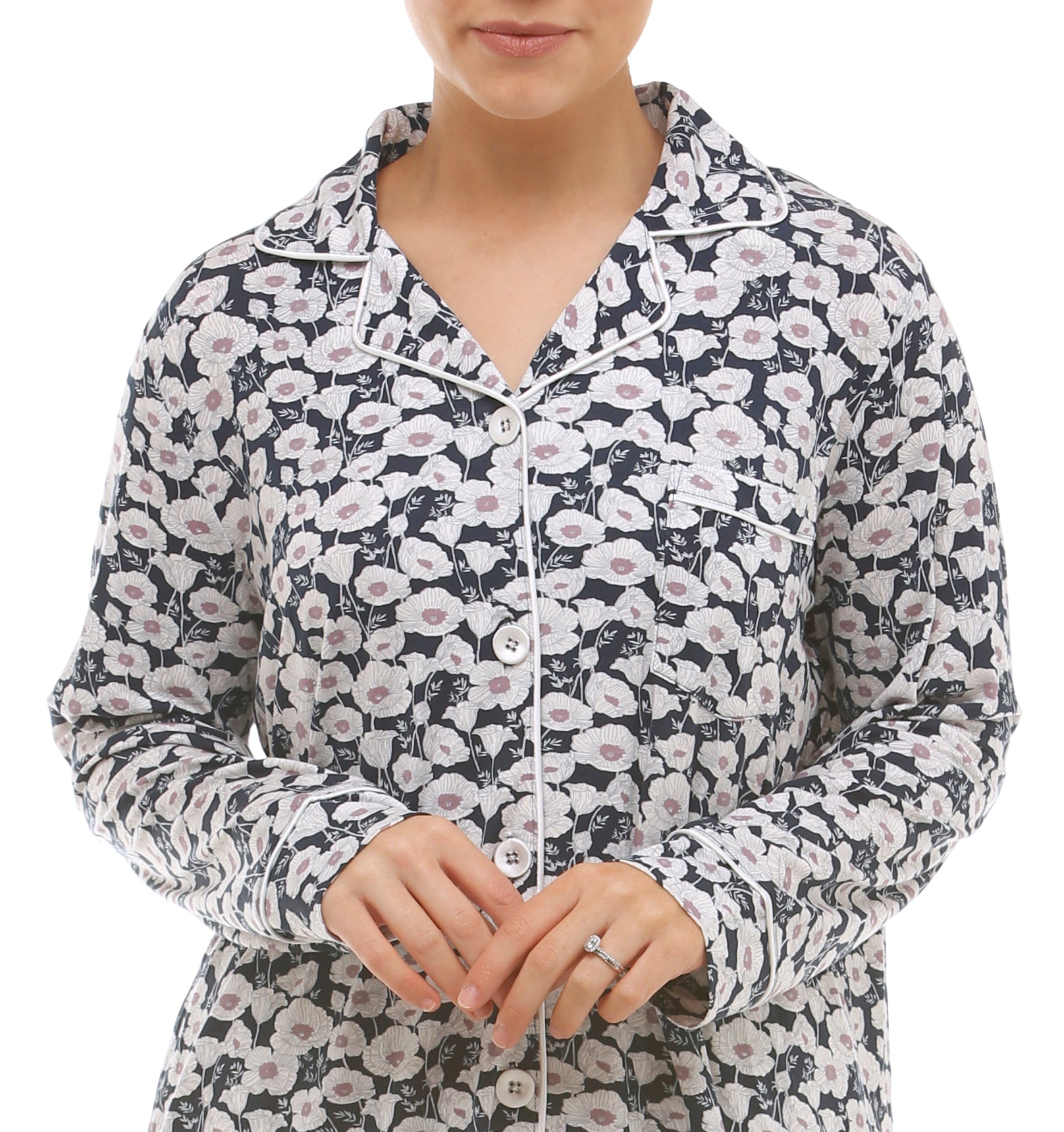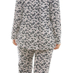 Just as it’s name suggests, the Poppy Revere pyjama set features a delightful abstract poppy print. The silky, soft viscose knit has beautiful drape and feels lovely against the skin.  All over floral design in a mix of navy, white and taupe.  The top is a button through style with contrast piping on the collar, button placket, chest pocket and cuffs.  The pant is straight leg with soft elastic waistband.