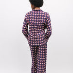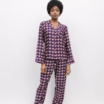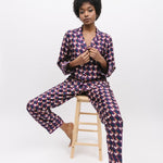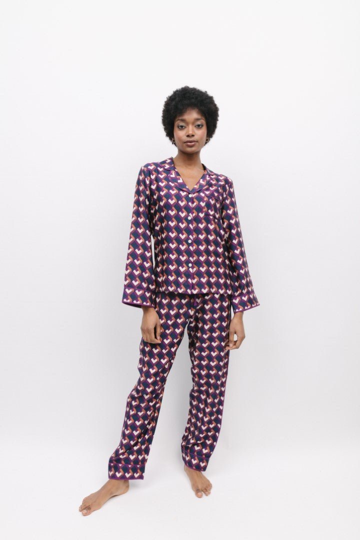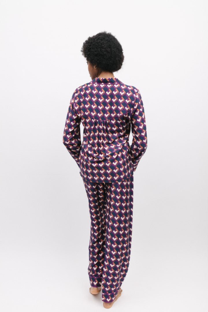 The Southbank geometric print PJ top from Fable and Eve has a shaped, revere collar, breast pocket, side splits and long sleeves trimmed with mauve modal. The Southbank geo print PJ pant has two side pockets, a flat front and elasticated back with adjustable drawstring for a personalised fit.