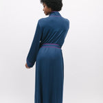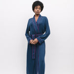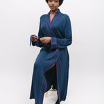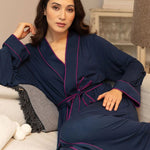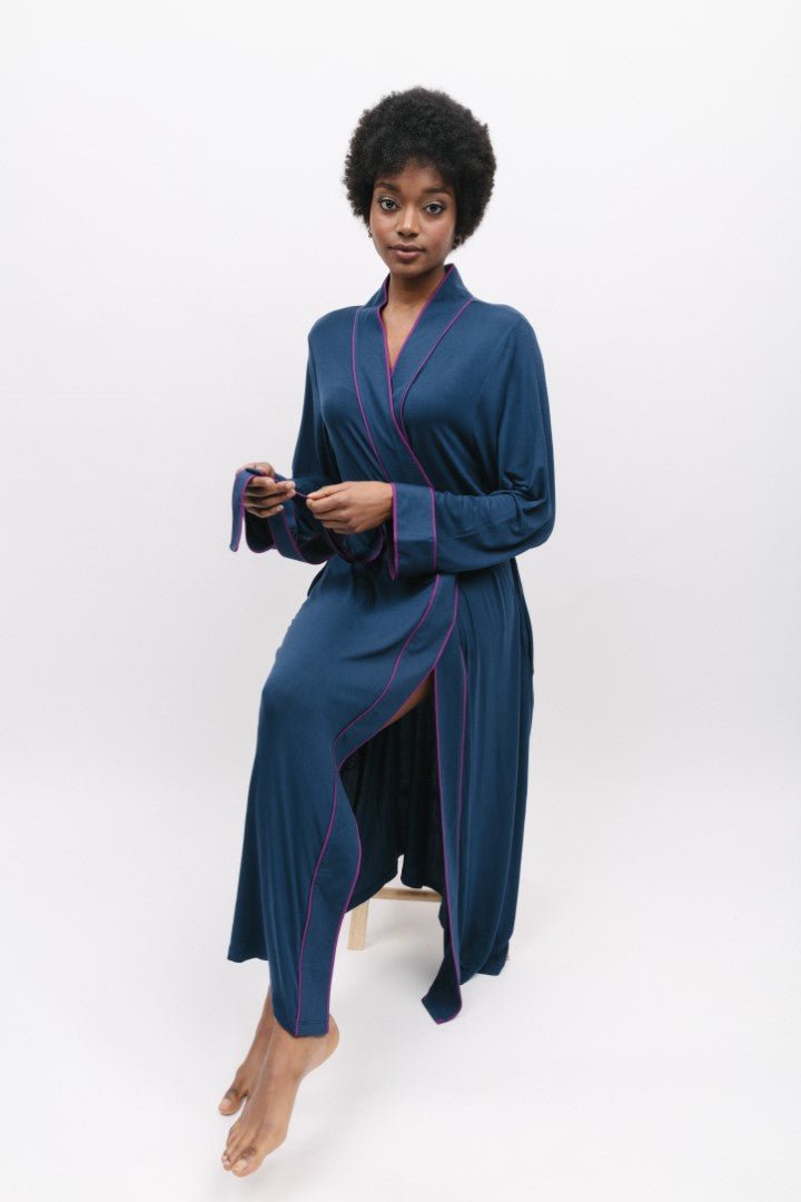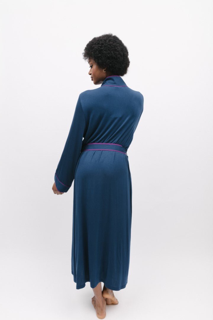 Long drape of this robe is fastened with two internal satin ties and a matching modal belt. With discrete side pockets this robe is functional and stylish. Trimmed with contrasting mauve modal, you'll want to lounge the day away in this.