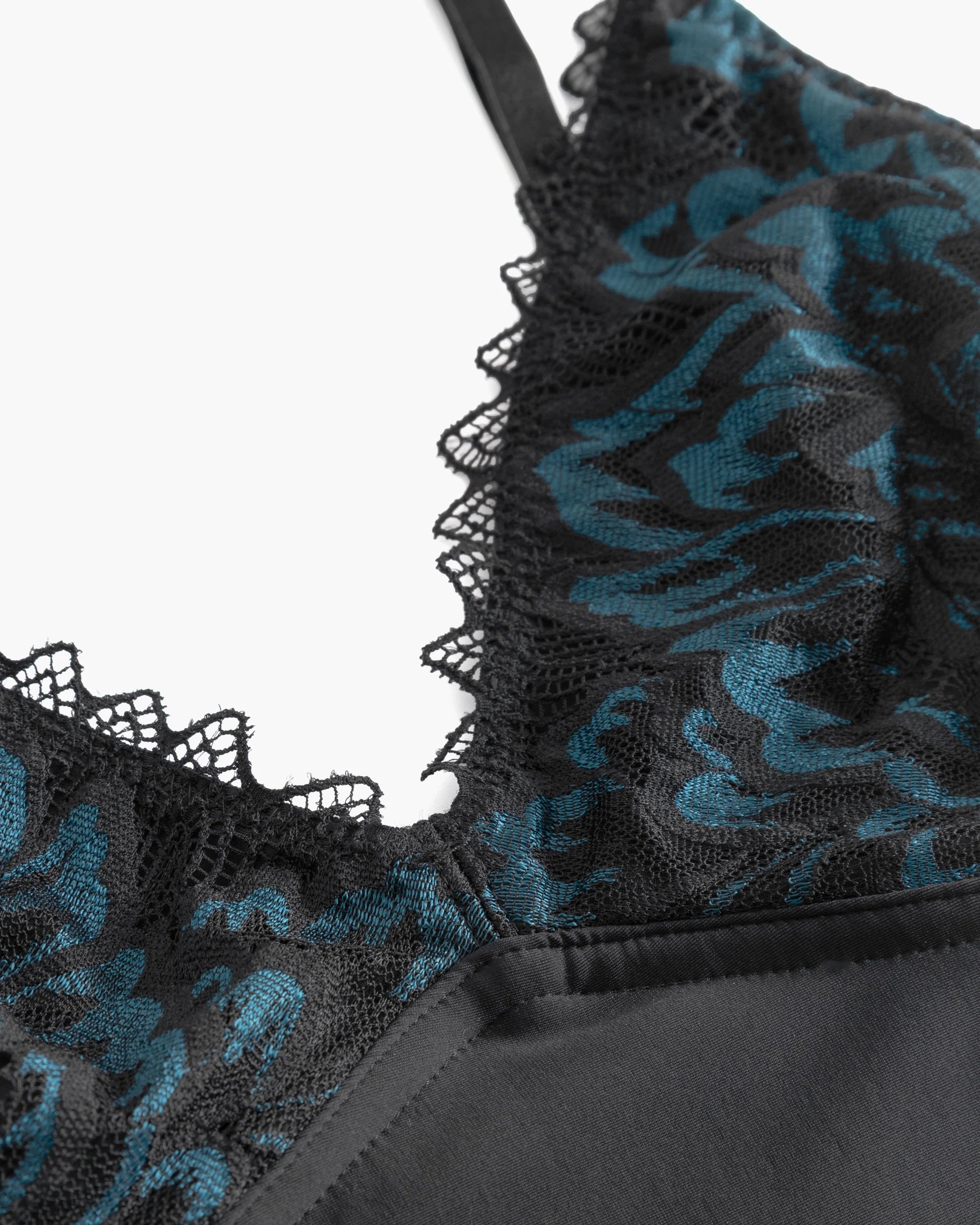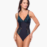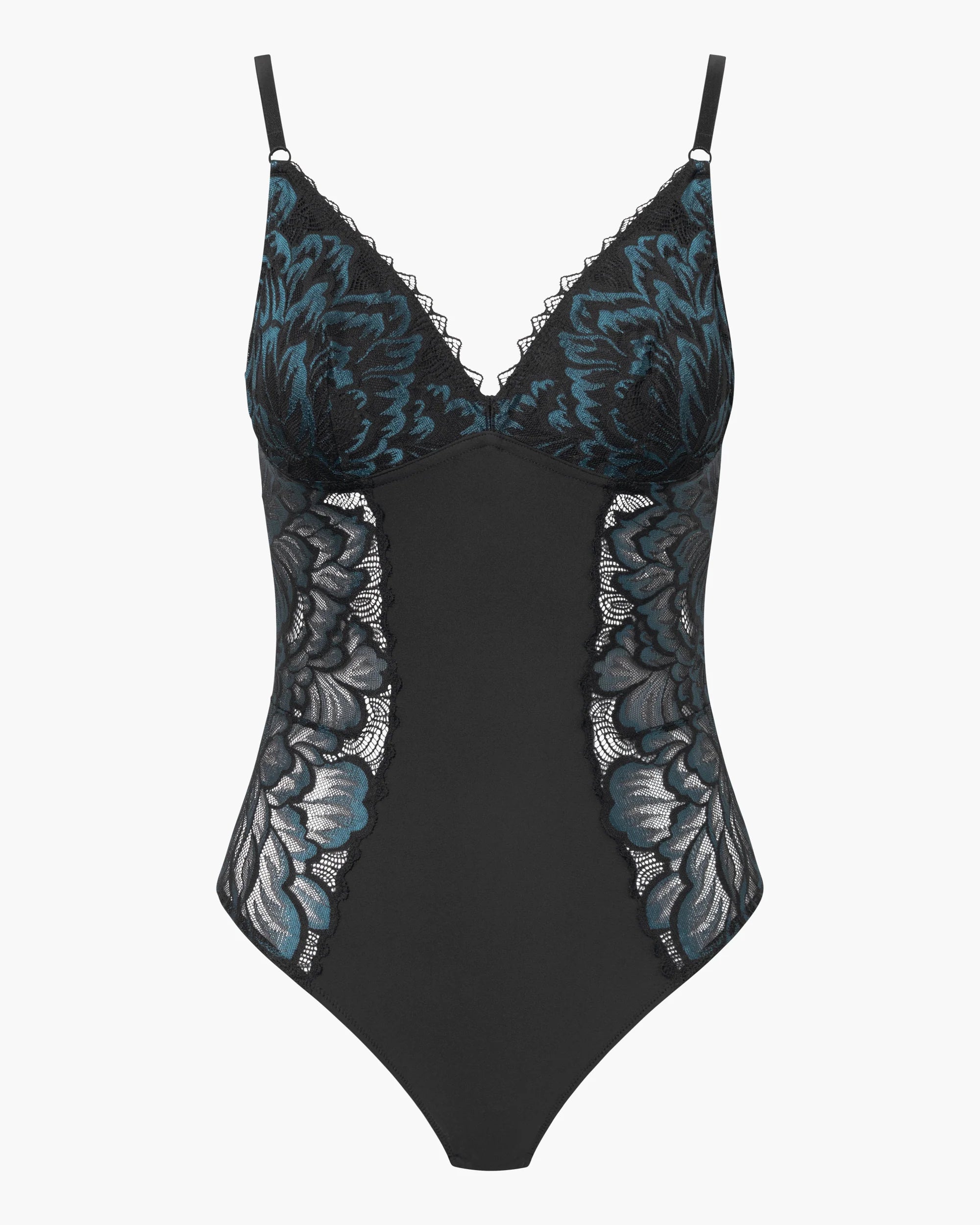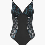 The Cosabella Encantata Shaping Bodysuit in Black/Canale offers the perfect fusion of sculpting power and breath taking Italian lace design. Featuring lightly padded cups, under-wire support, and a deep plunge neckline, this bodysuit shapes the torso beautifully while remaining soft, comfortable and exquisitely detailed.