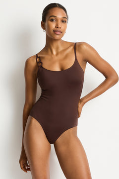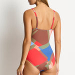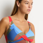 Sea Level Santora Collection, a vibrant retro abstract print in bold hues of khaki, cobalt, coral and chocolate. The Sea Level Cross Front Multifit one piece swimsuit is a classic and much loved style for its great fit qualities.