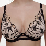 Close-up of floral lace and blush lining on Chantelle Lush Plunge T-Shirt Bra Black/Soft Pink, luxury designer lingerie.