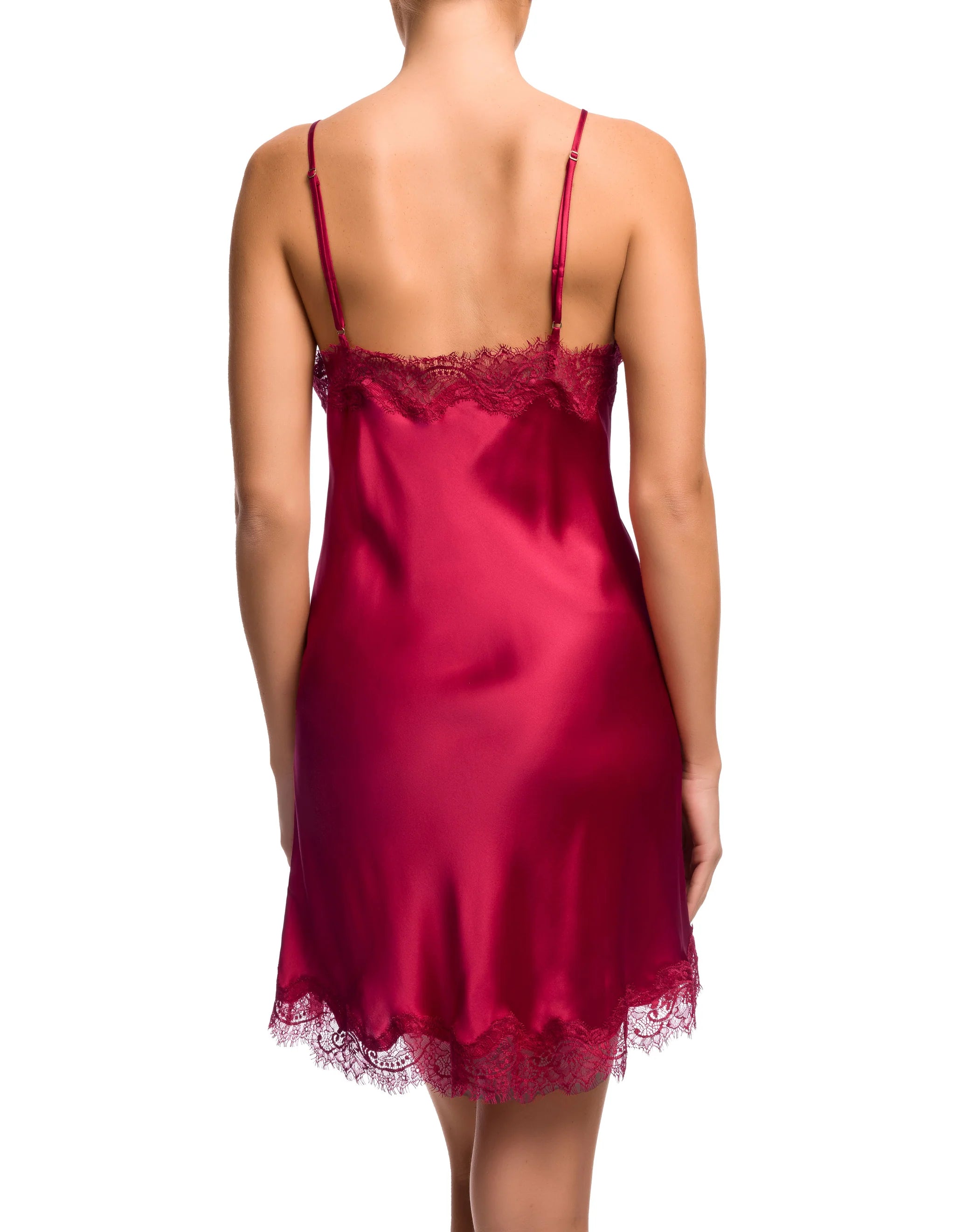 Kathryn Silk Chemise in rouge red with white lace trim, displayed hanging on a stone background.