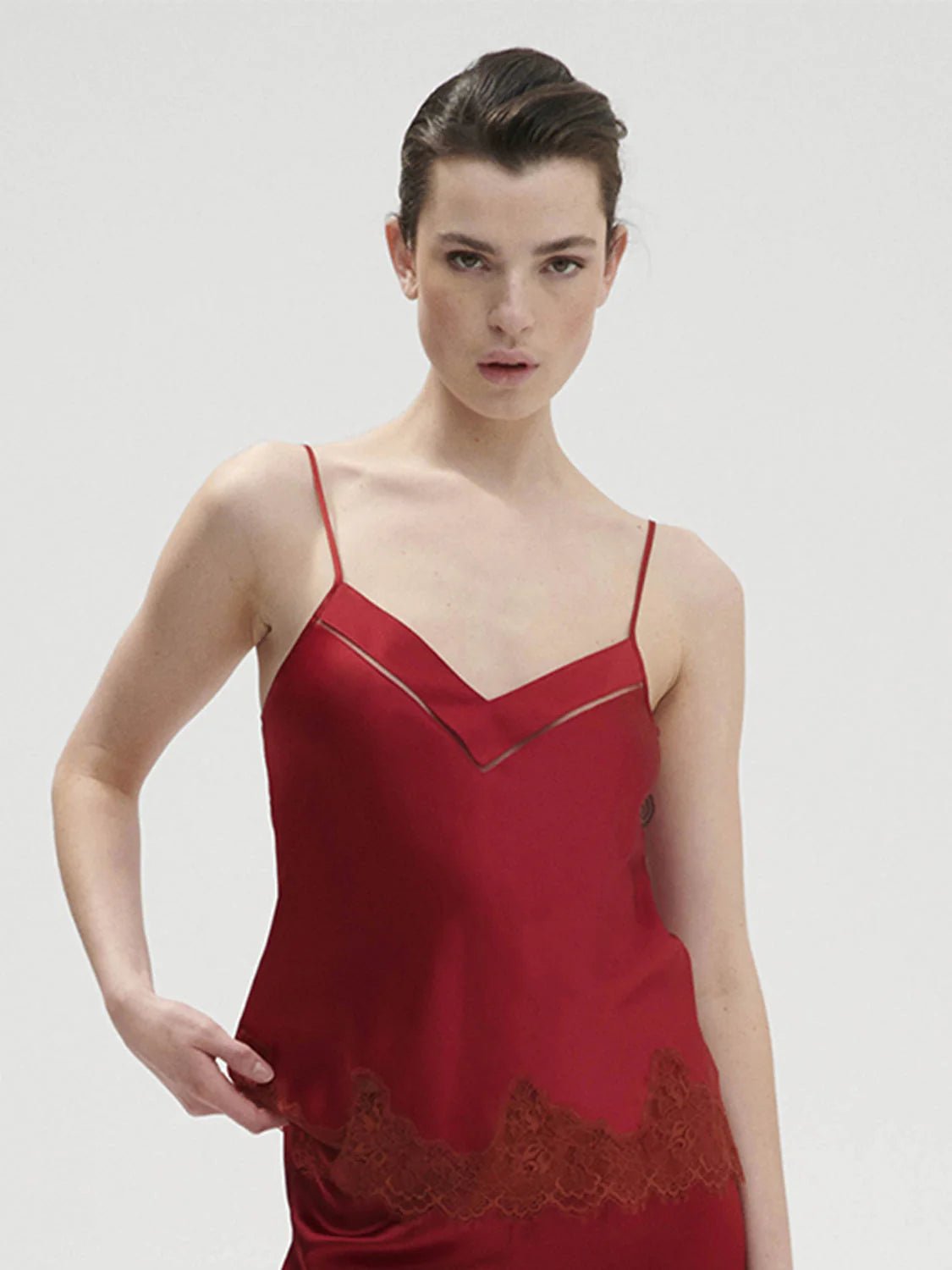 The Nocturne Silk Camisole by Simone Perele has a fine eyelash lace along the bottom, transparent tulle underlining the V neckline, and thin adjustable straps, you can wear it to bed, or wear it out – the choice is utterly yours.