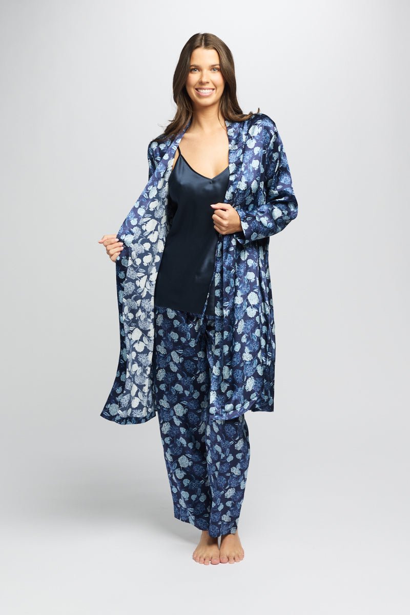 Model wearing navy Mono Silk Cami with printed blue pants, featuring a scoop neckline and wide straps.
