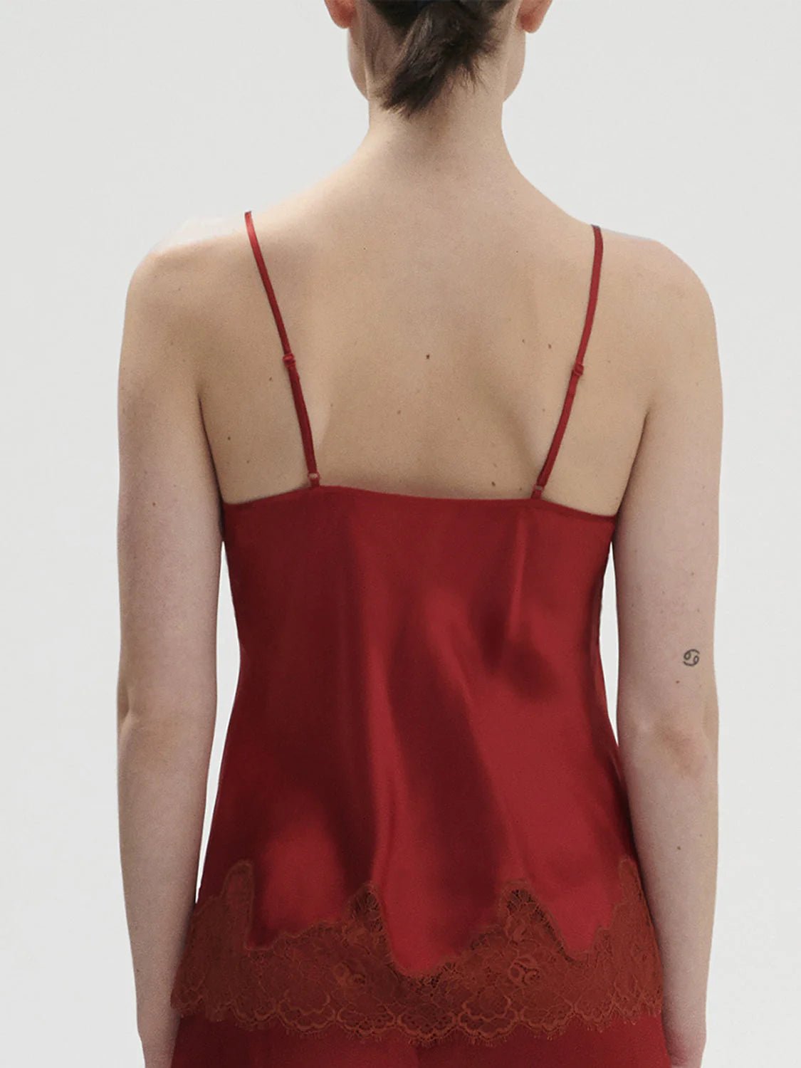 Back view of cerise silk cami top showing smooth fit and elegant drape.