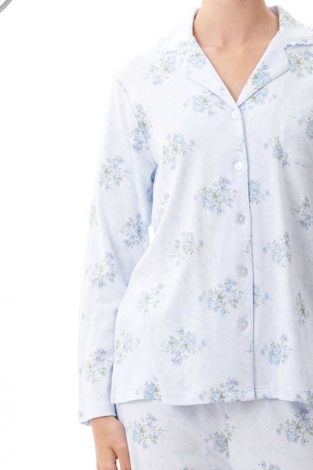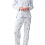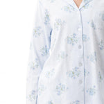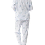 Combining cosy, comfortable knit jersey with a delicate soft blue floral print, our Arabella Long Pyjamas are sure to be a favourite as the nights turn cooler. The top collar has a narrow self frill, adding to the pretty design. The top has a chest pocket, and button front opening. The long leg pants have a soft elastic waist and self waist tie.
