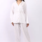 The classic revere collar shirt features long sleeves, button-through front and a single chest pocket for timeless style. Paired with relaxed, full-length cotton pyjama pants with an elastic waist and side pockets, this set offers both elegance and practicality. Perfect for women who love the crisp, airy feel of woven cotton sleepwear.