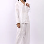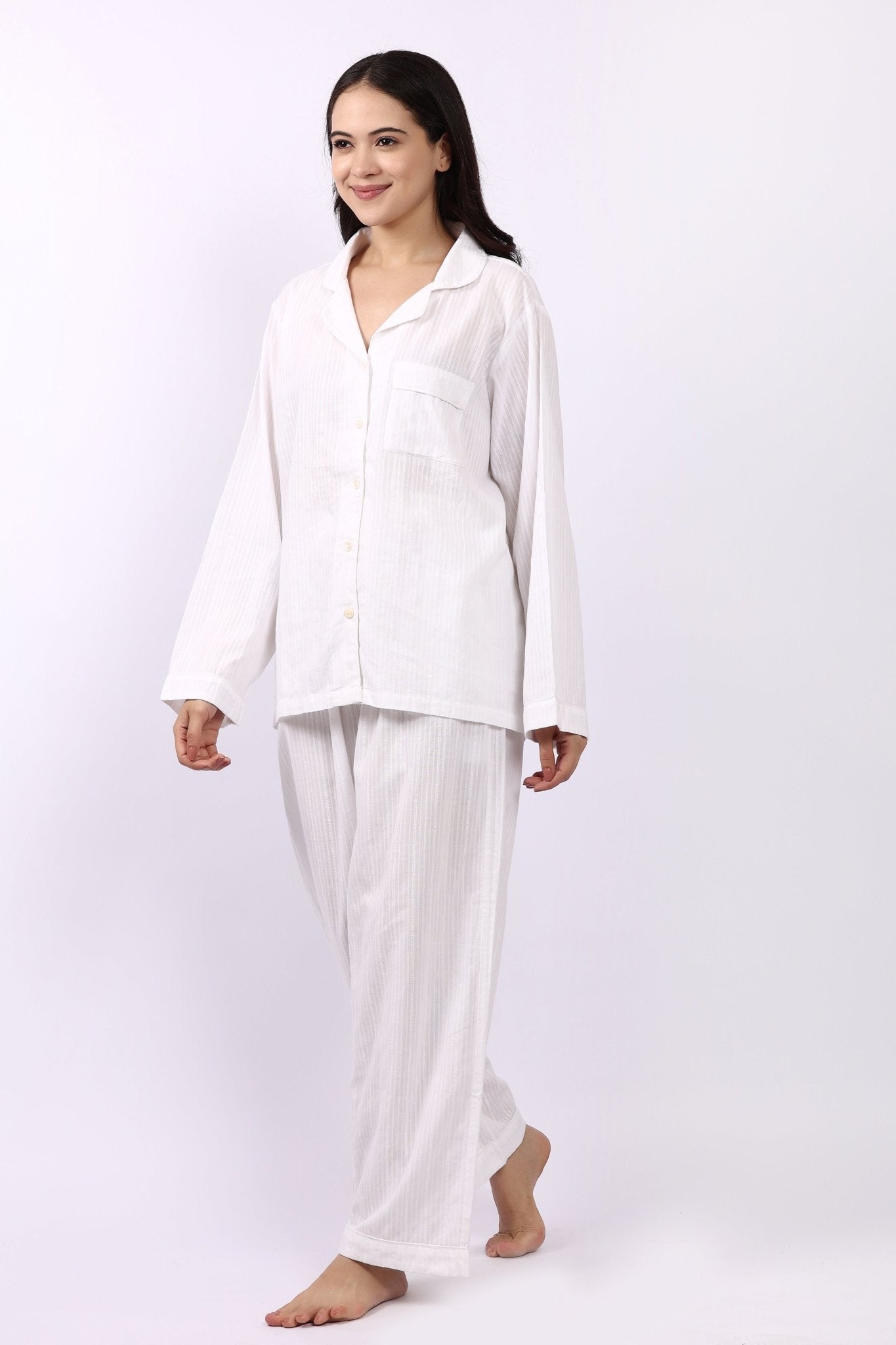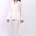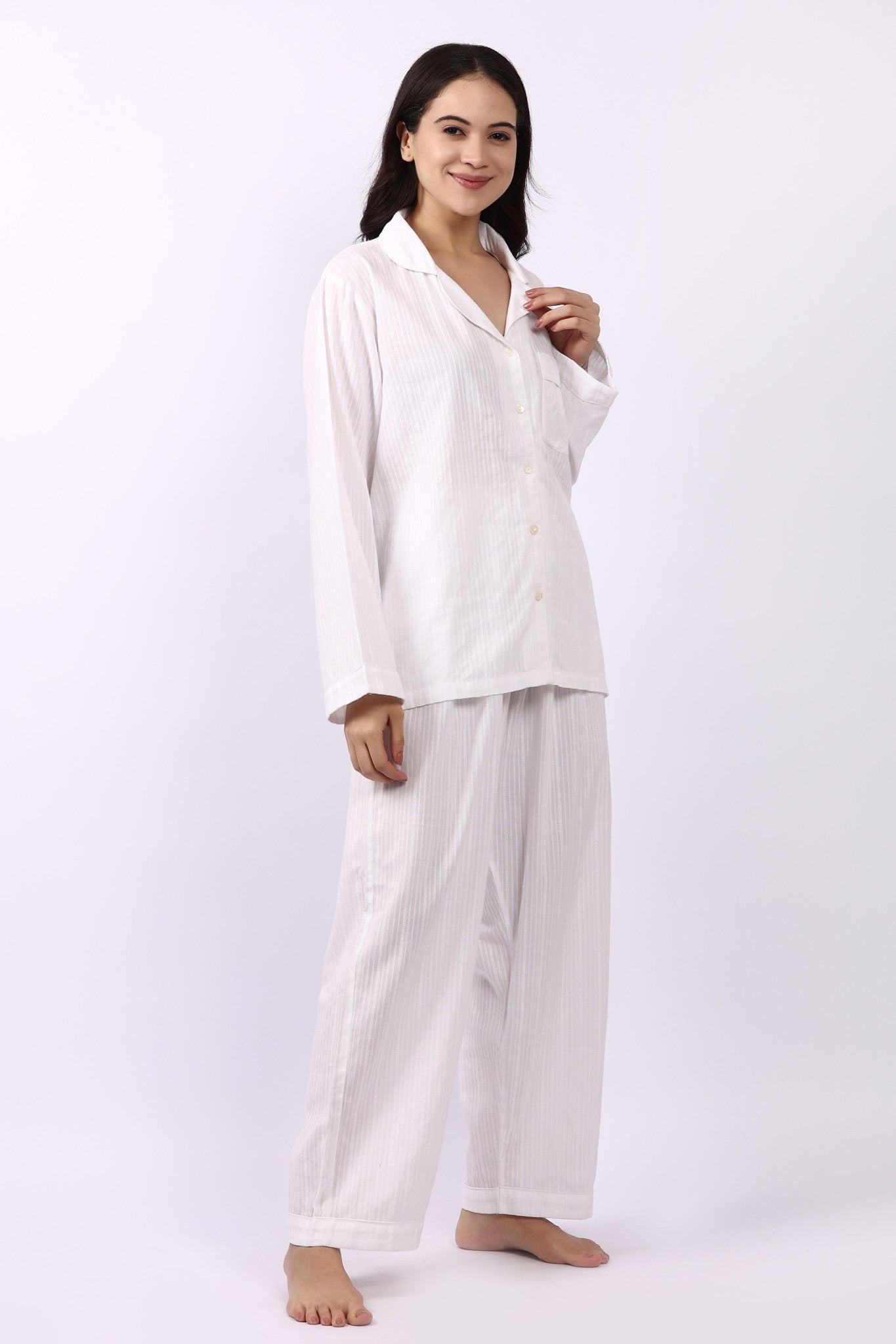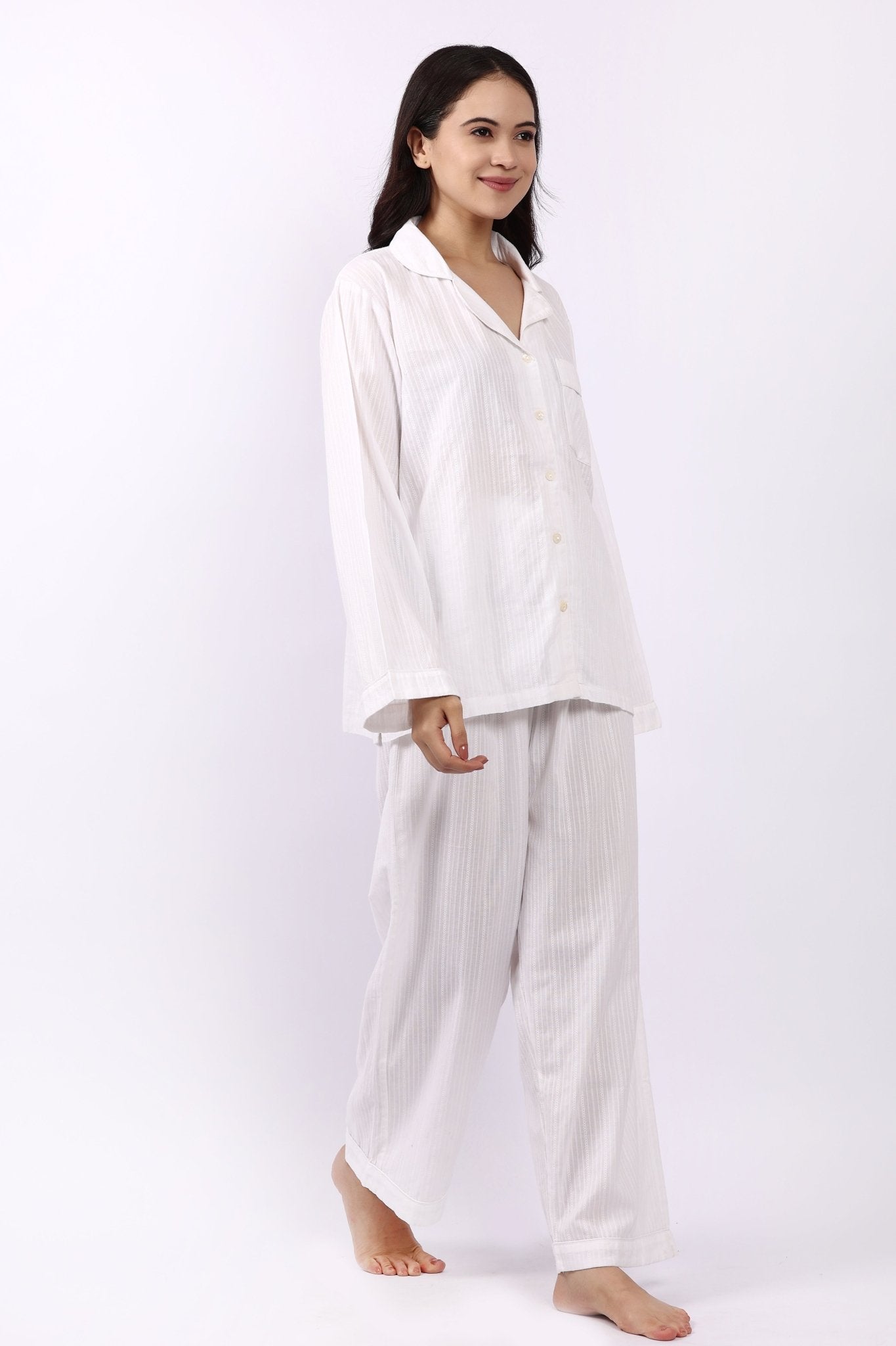 Woman wearing Lotus Jacqui revere long pyjama set in white self-stripe cotton, shirt and pants.