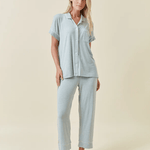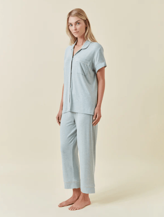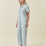 The classic button-through top is finished with crisp white piping, adding a tailored touch to this relaxed style. Paired with cropped pyjama pants featuring an elastic waistband and drawcord, this set combines effortless wearability with refined detail. Perfect for women seeking modal pyjamas, breathable sleepwear, or a sage cotton-alternative PJ set, the Kate Crop PJ is as versatile for lounging as it is for sleeping.
