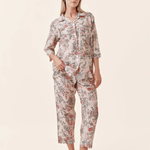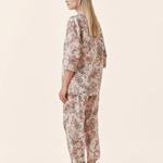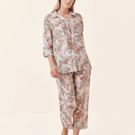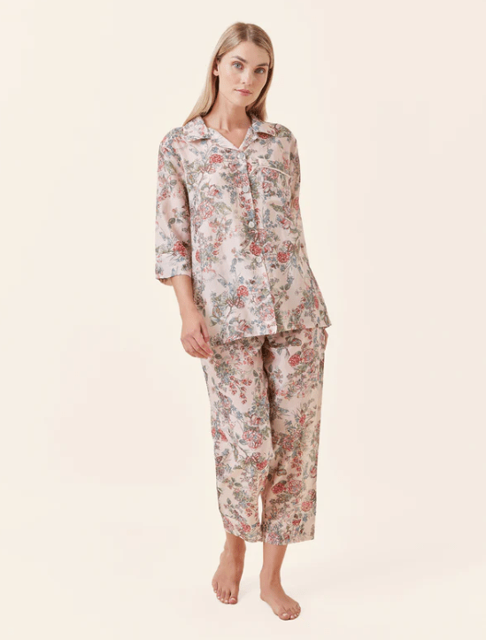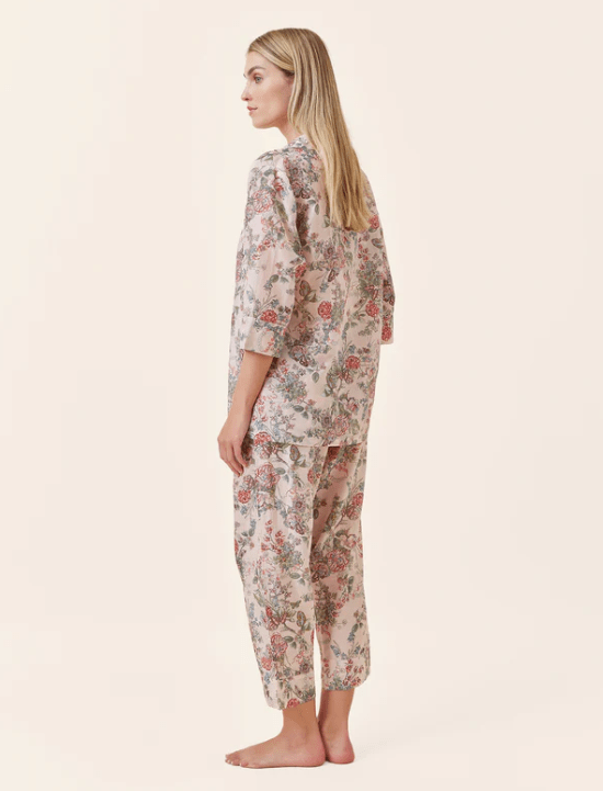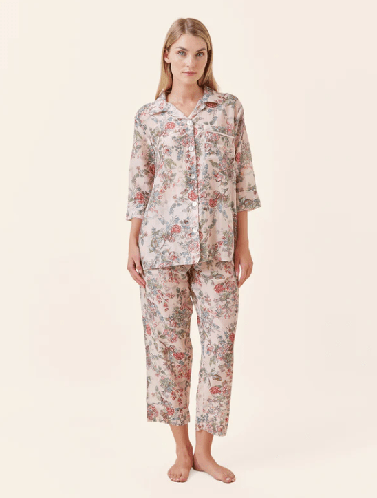 Crop-length pants with elastic and drawstring waist tie provide a relaxed, lounge-friendly fit. With its all-over floral print, subtle sheen from the silk, and comfortable crop style, this PJ set delivers floral cotton-silk pyjamas, luxury crop pyjama set, and nighttime lounge wear in one.