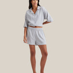 The Papinelle Sabine Seersucker Stripe Boxer PJ Set pairs breezy comfort with timeless charm. Crafted from a lightweight and breathable blend of 50% cotton and 50% Lenzing™ Ecovero™ viscose, this set features a relaxed-fit button-down shirt with a notch collar, shell buttons, and roomy chest patch pockets, plus boxer-style shorts with a full elastic waistband and handy side-seam pockets—ideal for warm nights or lounging.