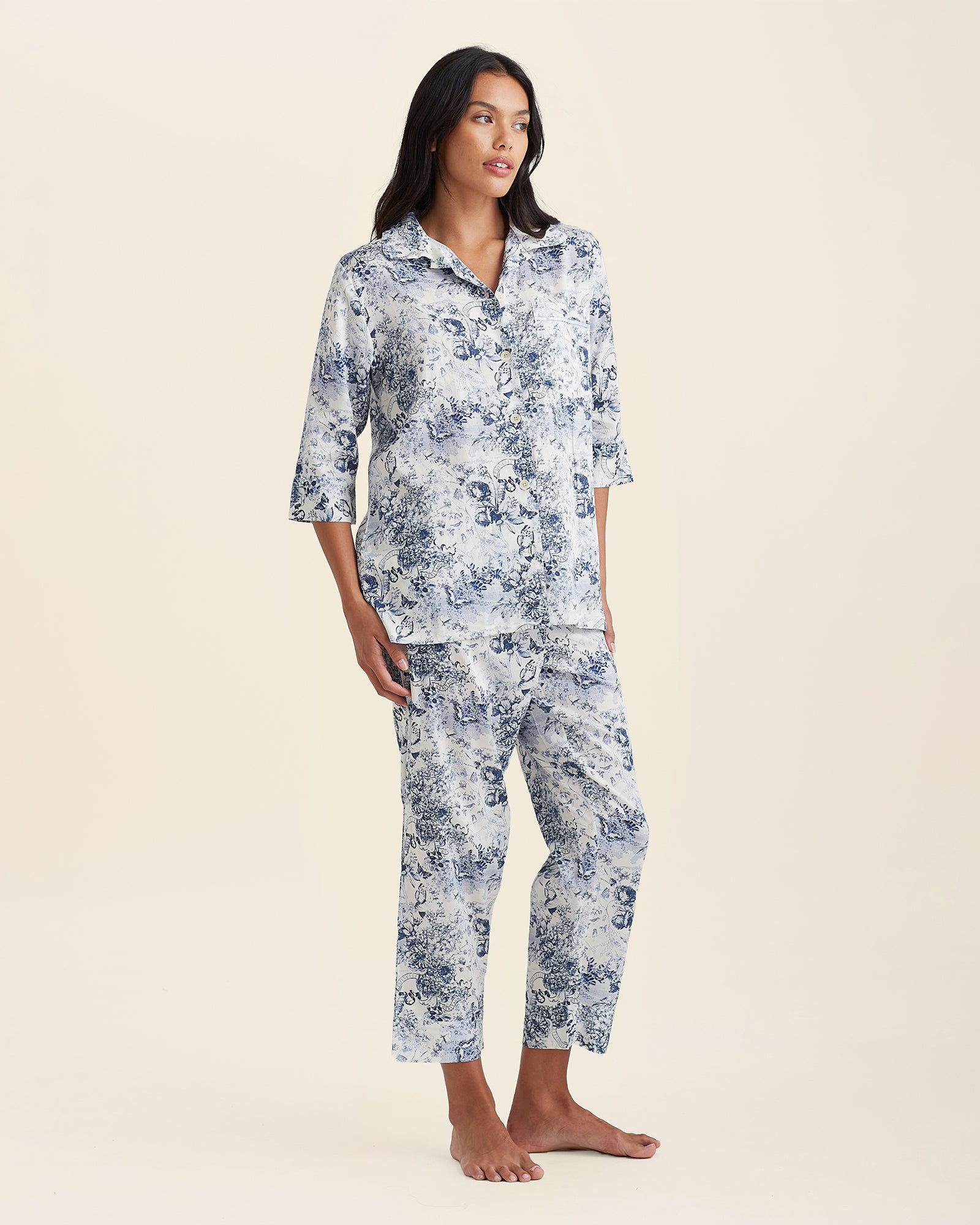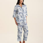Front view of Papinelle Toile De Jouy Crop PJ Set in cotton print, featuring button-up shirt and cropped pants with drawstring waist.
