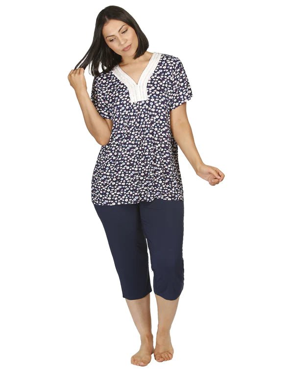Experience luxurious comfort at its finest with this Tulip PJ Set from YUU. Crafted from a silky, soft viscose knit, it features a Tulip print top with a soft satin and lace neck trim, as well as plain crop pants for a timelessly elegant look. Perfect for lounging at home or for lazy Sundays, you won't be disappointed with this sophisticated and exclusive sleepwear set.
