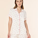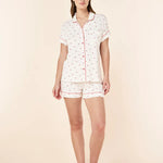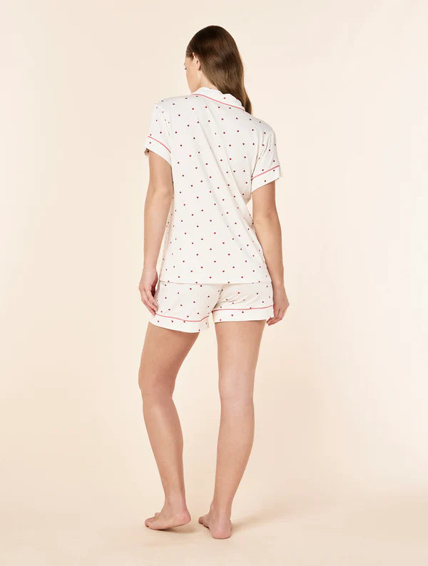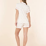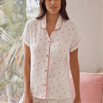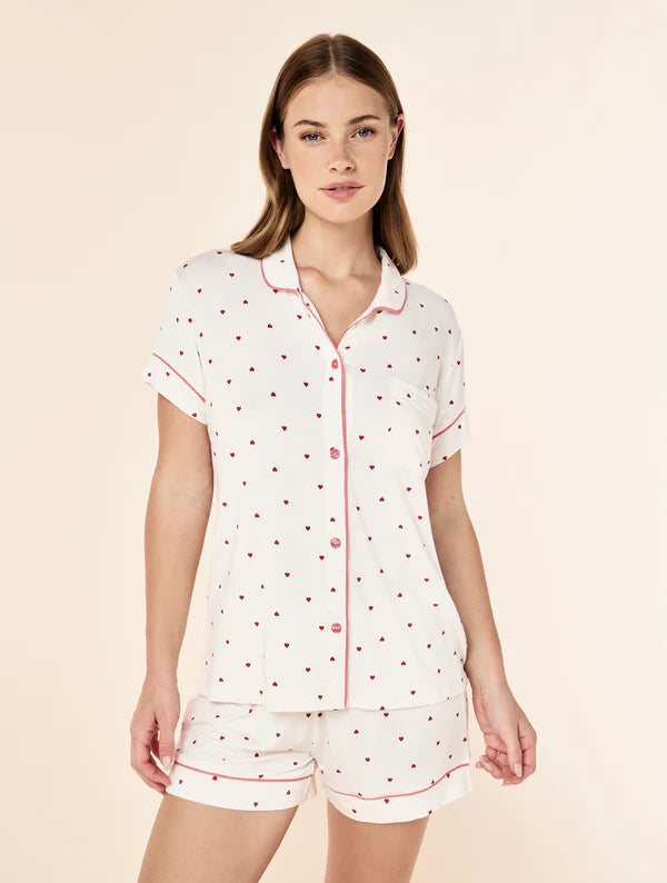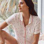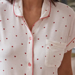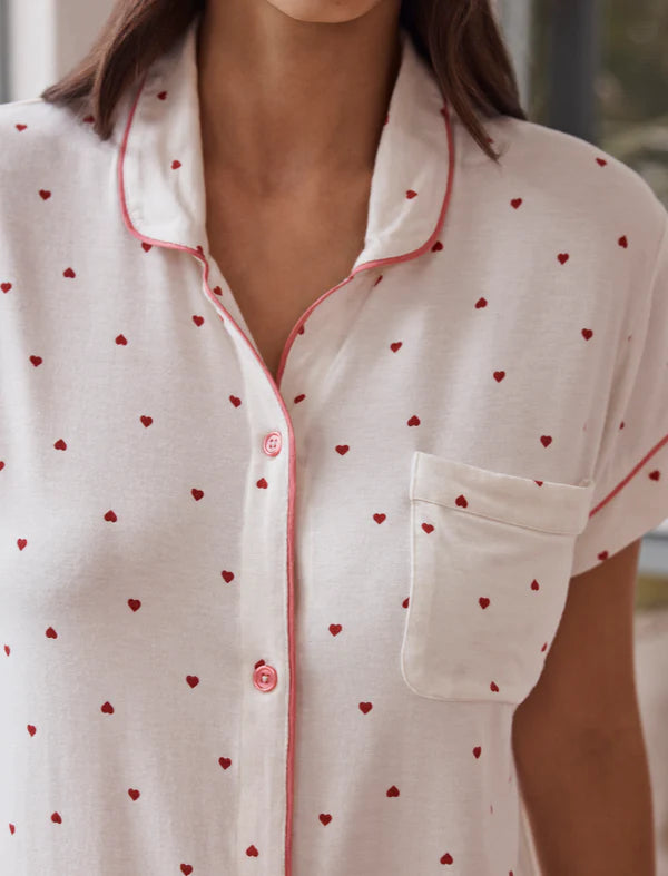 The short-sleeve button-up top features a soft collar, chest pocket, and contrast piping for a refined finish that feels polished yet relaxed. The delicate Desert Rose Hearts print adds a playful, feminine touch while remaining understated and easy to wear. Matching shorts are finished with a comfortable elastic waistband and adjustable drawcord, offering an easy, flexible fit that moves with you.