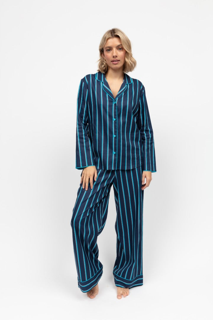 The long-sleeve top features a classic revere collar with bright blue pinstripe detailing on a rich navy base, paired with aqua trim and thoughtful, covered buttons. Together these little touches give timeless style to a relaxed silhouette that feels effortless and flattering — perfect for curling up with a good book or easing into a slow morning.
