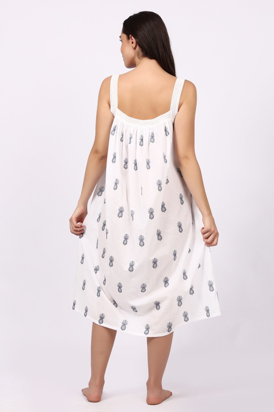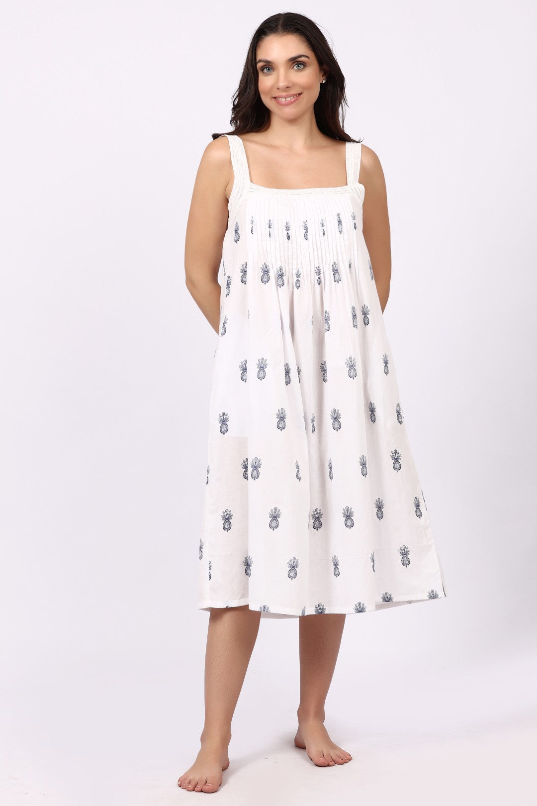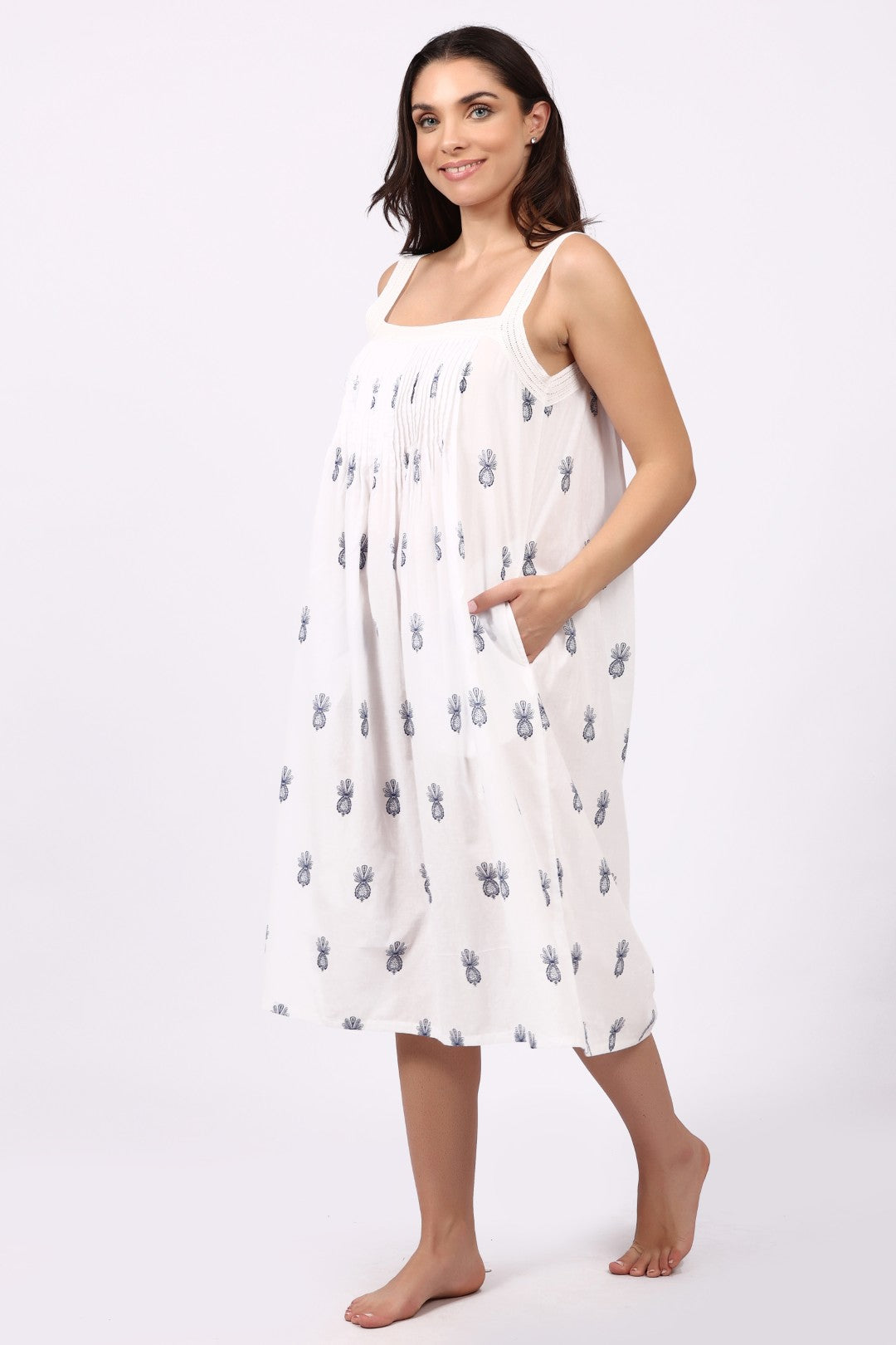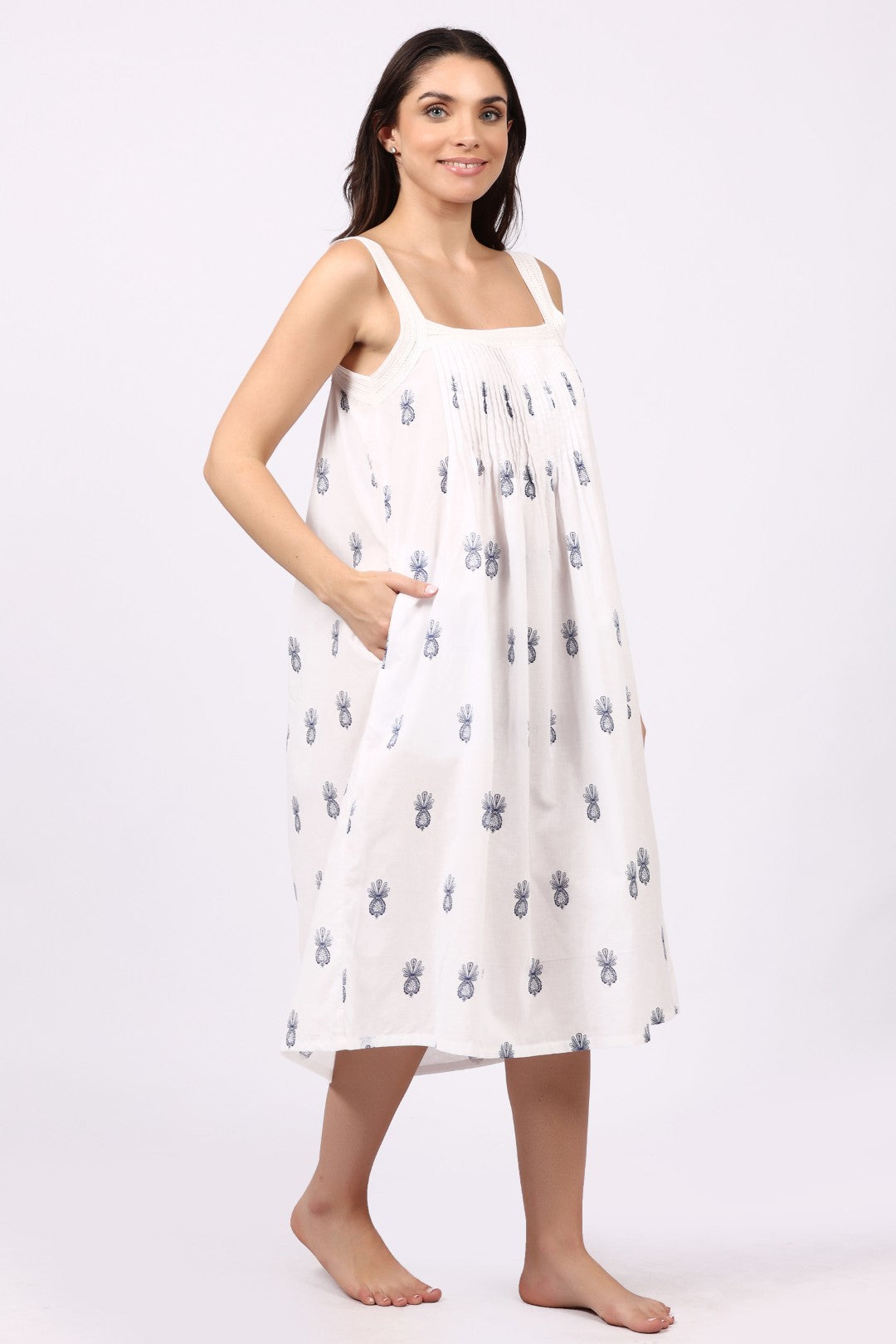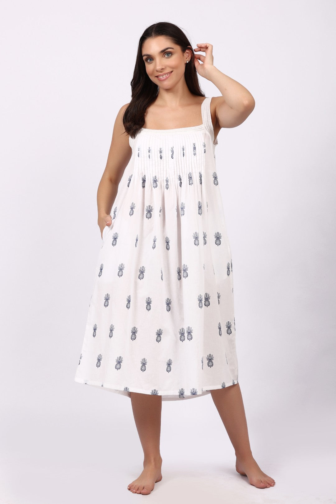 The White/Navy colourway features a crisp white base printed with navy blue pineapples — classic, fresh and perfect for summer nights. Lightweight, breathable and beautifully made, this cotton nightdress keeps you cool and comfortable from evening unwind to early morning.