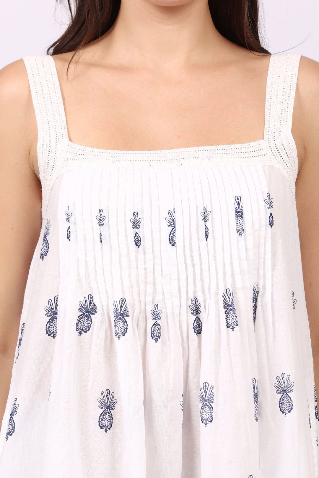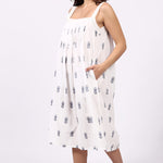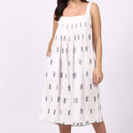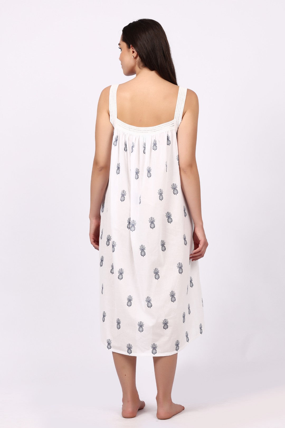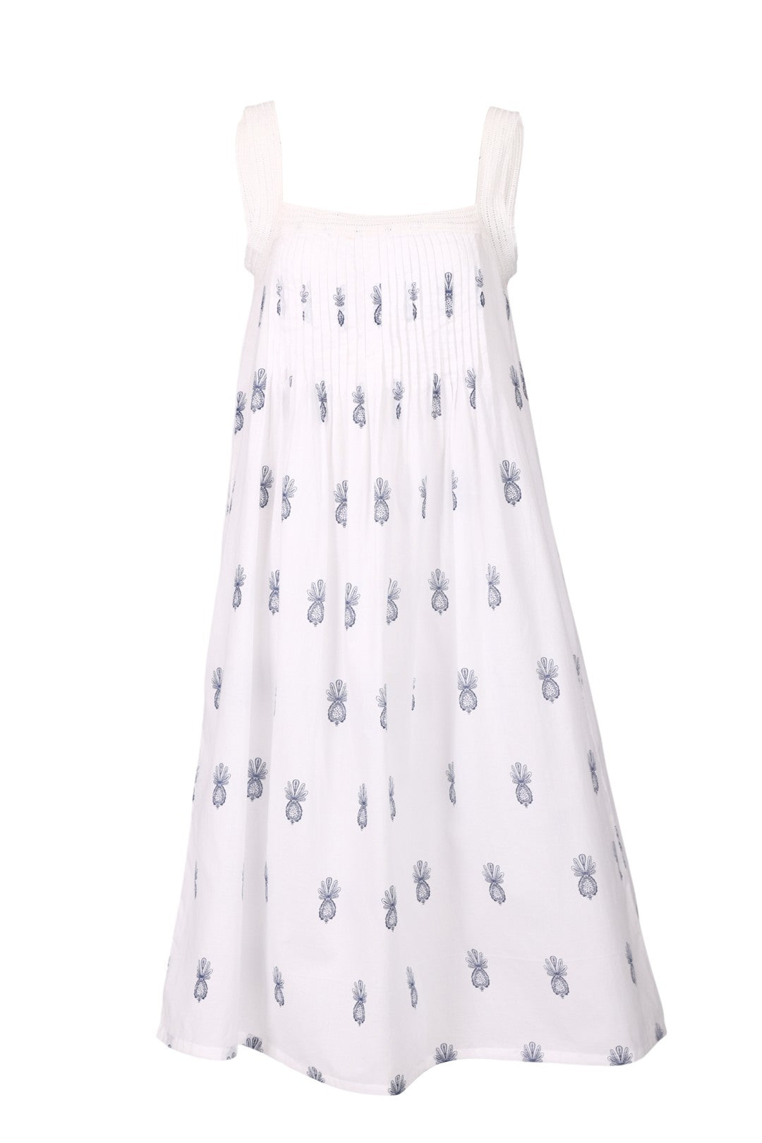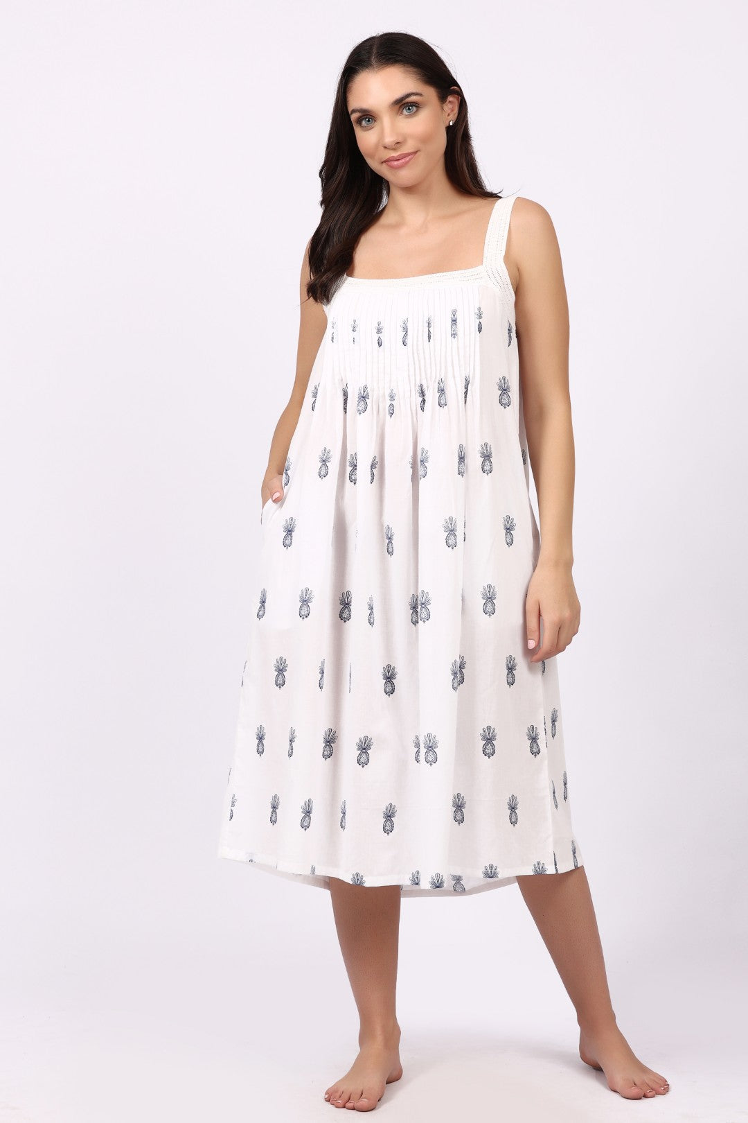The White/Navy colourway features a crisp white base printed with navy blue pineapples — classic, fresh and perfect for summer nights. Lightweight, breathable and beautifully made, this cotton nightdress keeps you cool and comfortable from evening unwind to early morning.