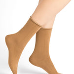 Warm, wool mid-length socks for women from Bleuforêt are French-made luxury for your feet in a perfect light brown, neutral colour "fauve". These ladies woolen socks are cotton-lined so that the 100% merino wool does not come in contact with the skin to reduce any itch or irritation on the skin. These women's socks have roll tops so they don't dig into your legs and they are fine and soft enough to wear with shoes or boots for winter.