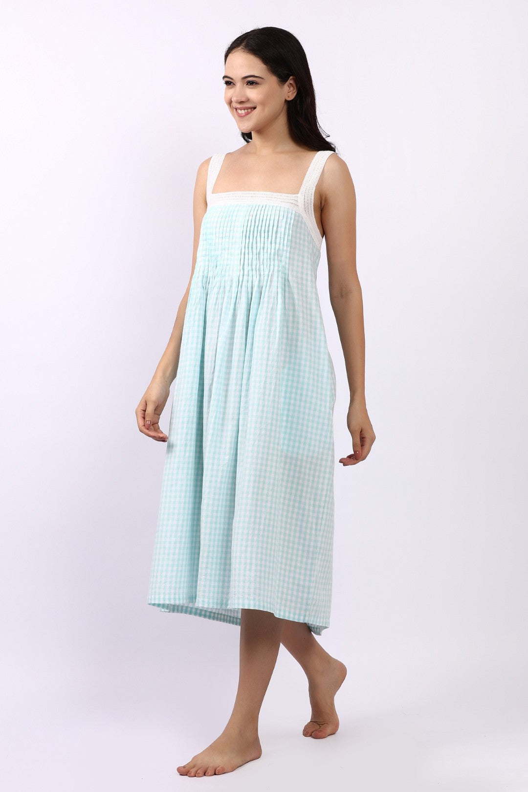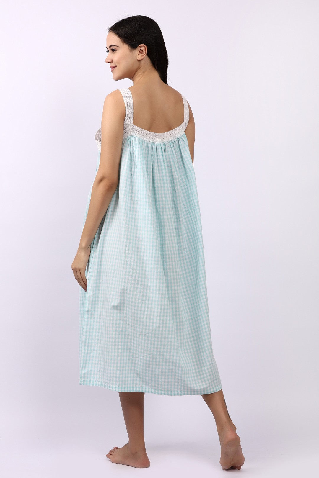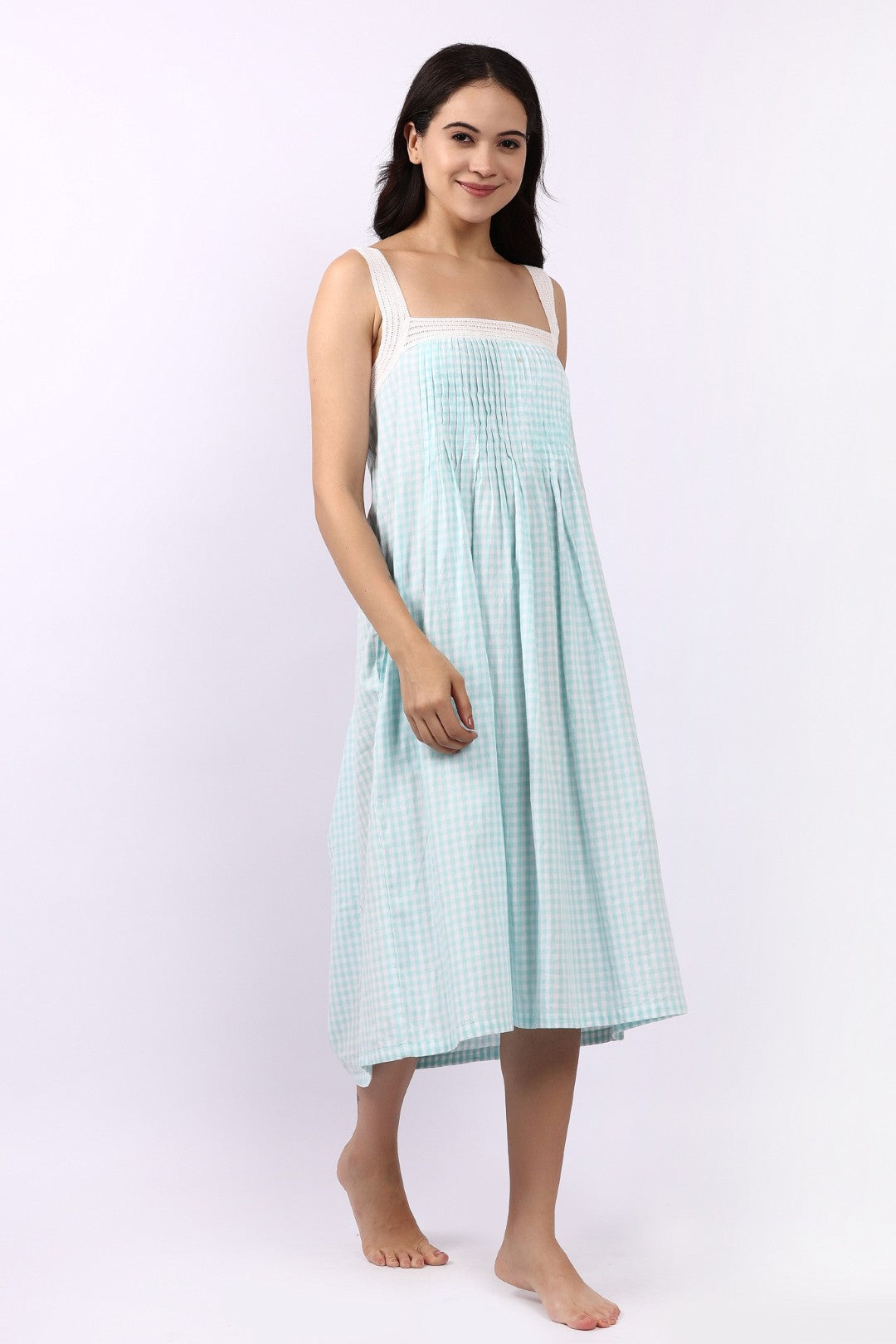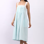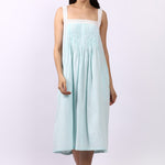 The Lotus Strappy Pintuck Nightdress in Aqua Gingham is a refreshing blend of vintage charm and cool, breathable comfort. Crafted from Lotus’s signature lightweight Indian cotton, this nightdress floats effortlessly over the body — soft, airy and beautifully easy to wear.