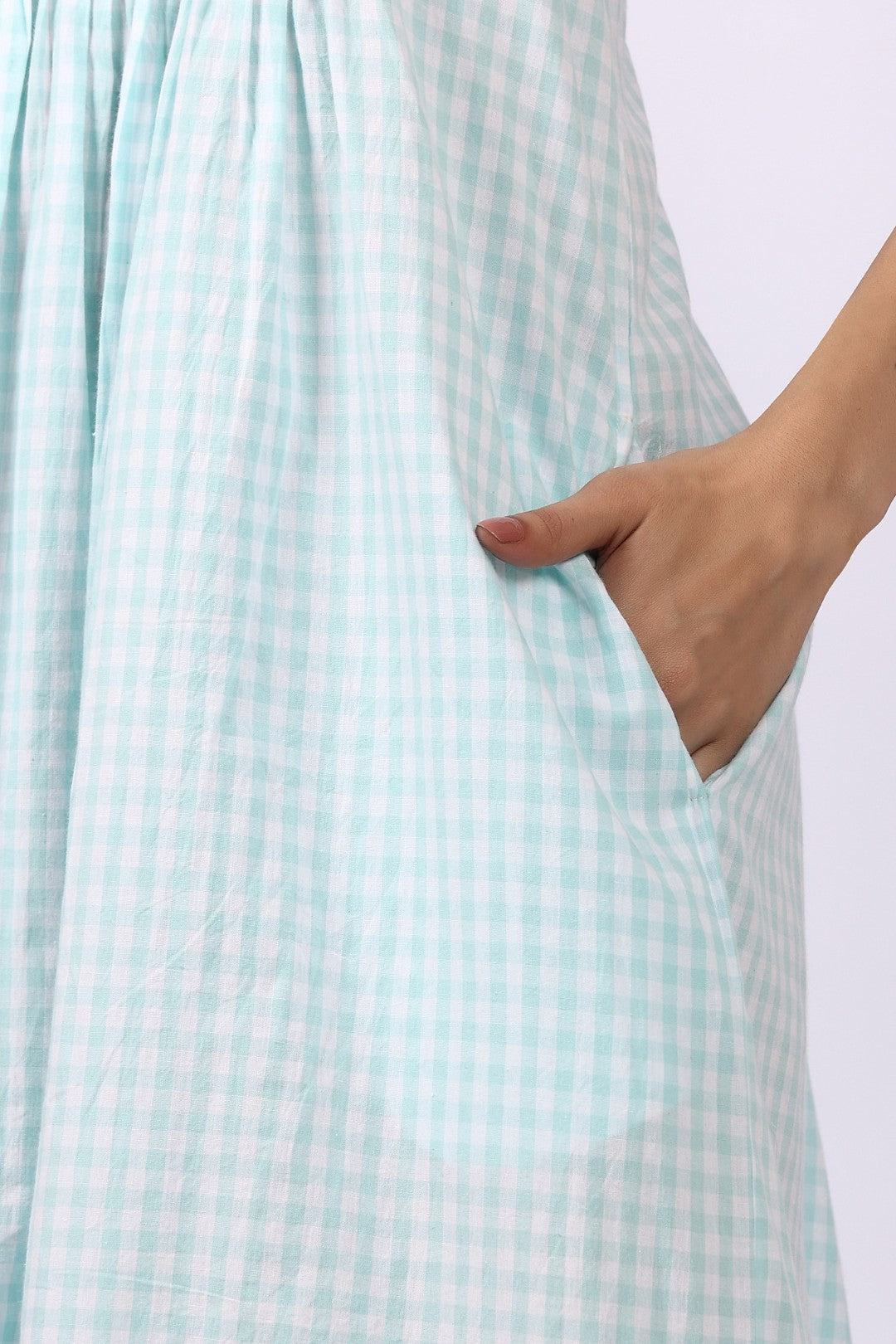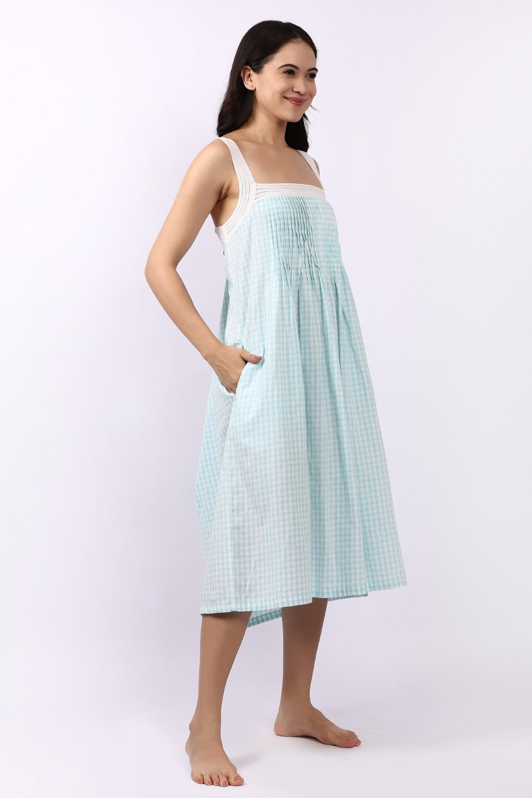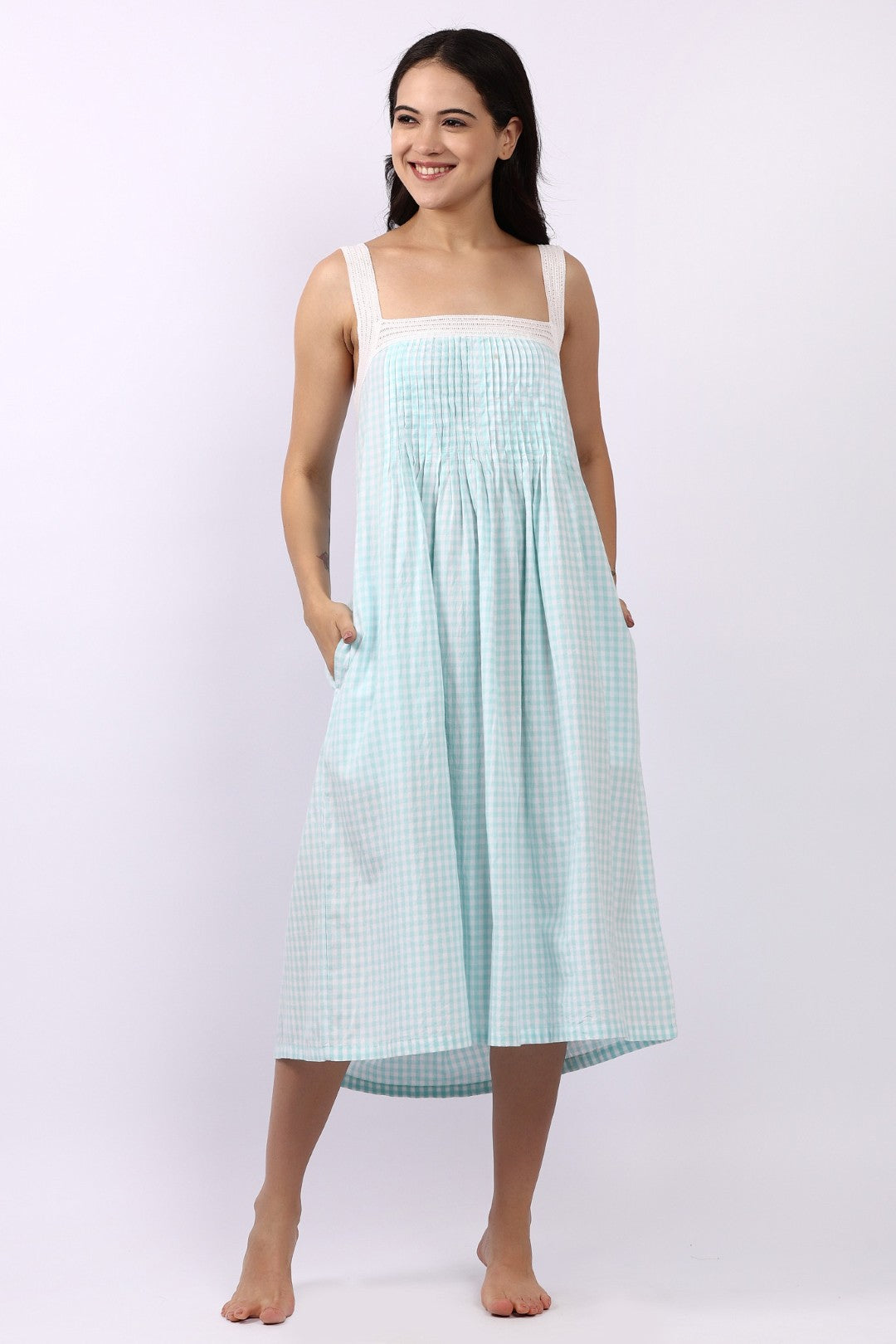 The Lotus Strappy Pintuck Nightdress in Aqua Gingham is a refreshing blend of vintage charm and cool, breathable comfort. Crafted from Lotus’s signature lightweight Indian cotton, this nightdress floats effortlessly over the body — soft, airy and beautifully easy to wear.