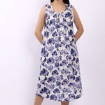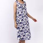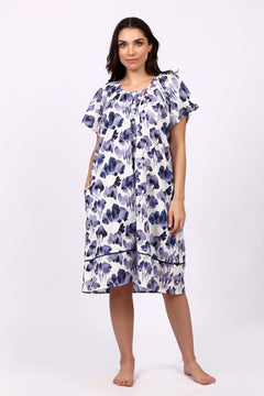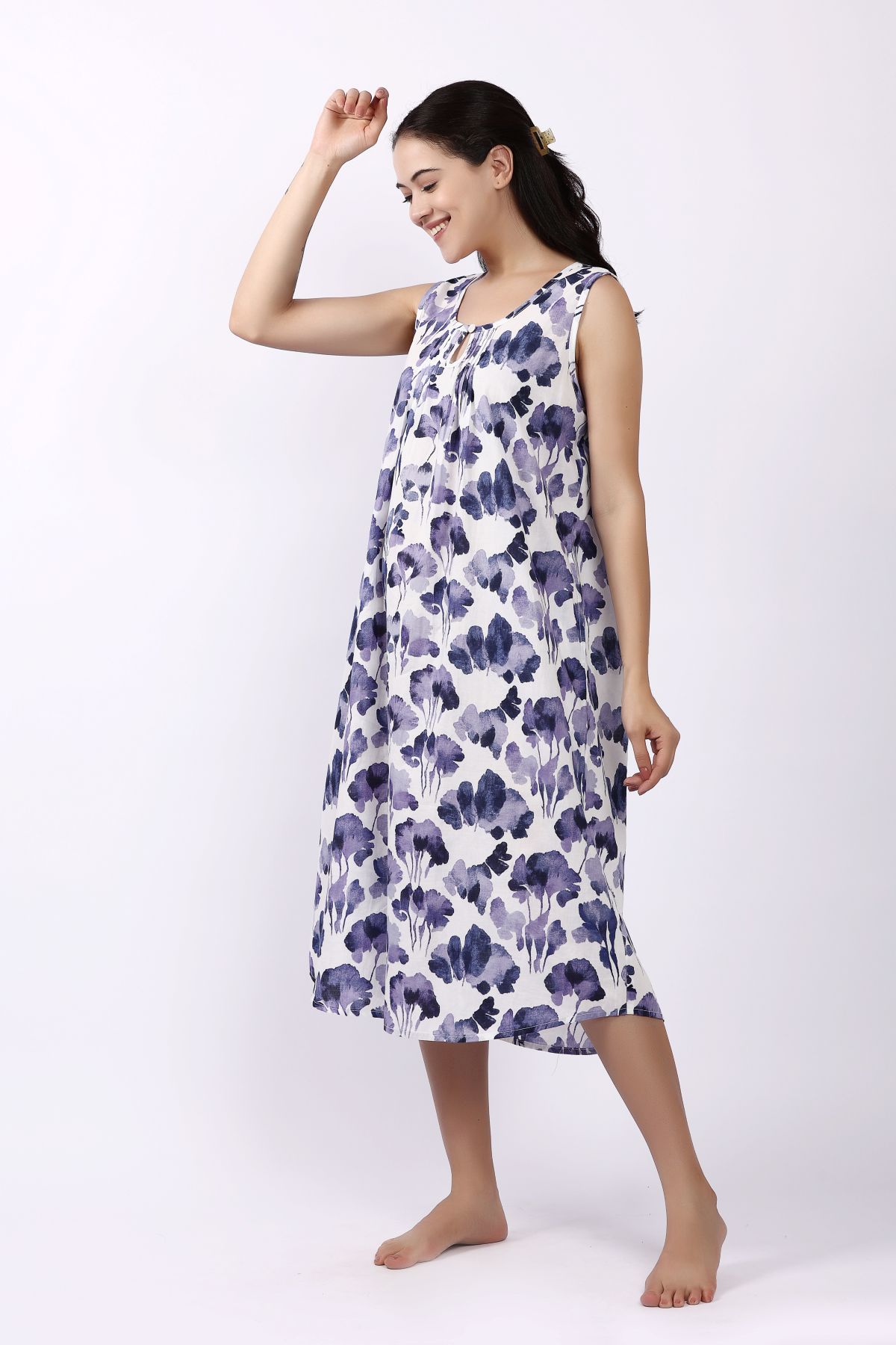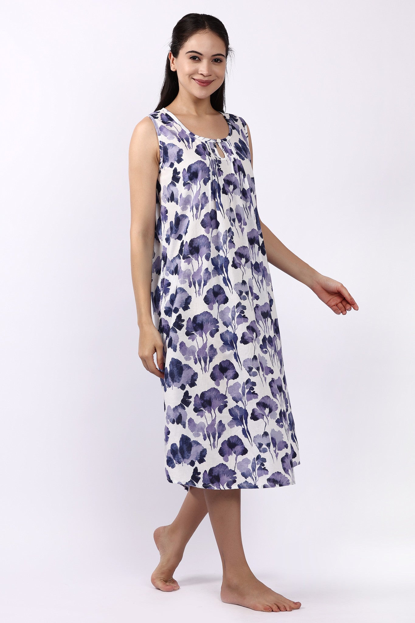 The sleeveless design and flowing shape offer complete freedom of movement, while the soft gathers and keyhole neckline add a feminine, flattering touch. The navy watercolour floral print brings fresh elegance to this easy-to-wear nightdress — perfect for warm evenings when you want to feel relaxed yet refined.