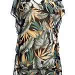 Resting upon a black ground, we just love how the sage green and mango accent tones have been weaved into the design through the leaves and abstract cantaloupe slices.